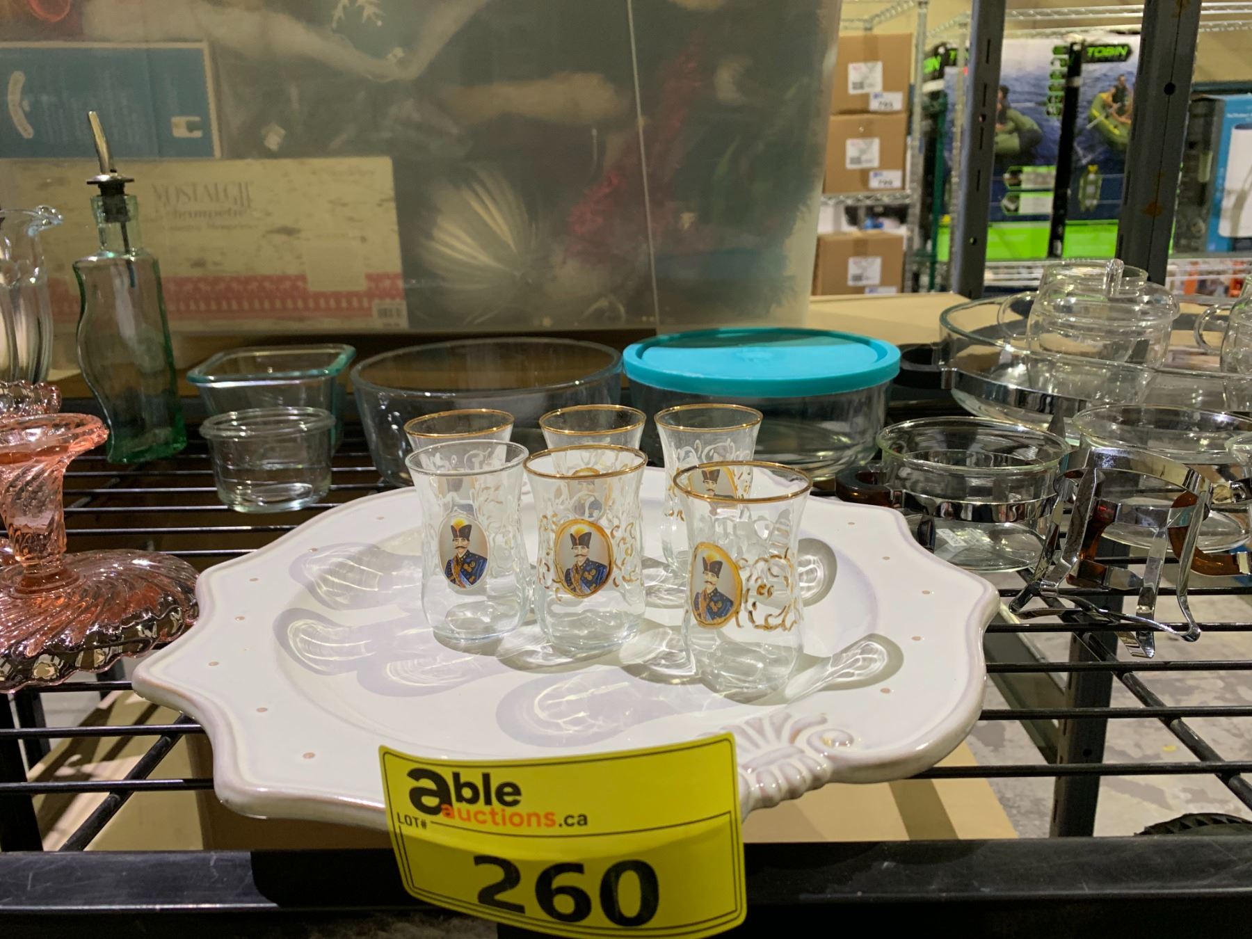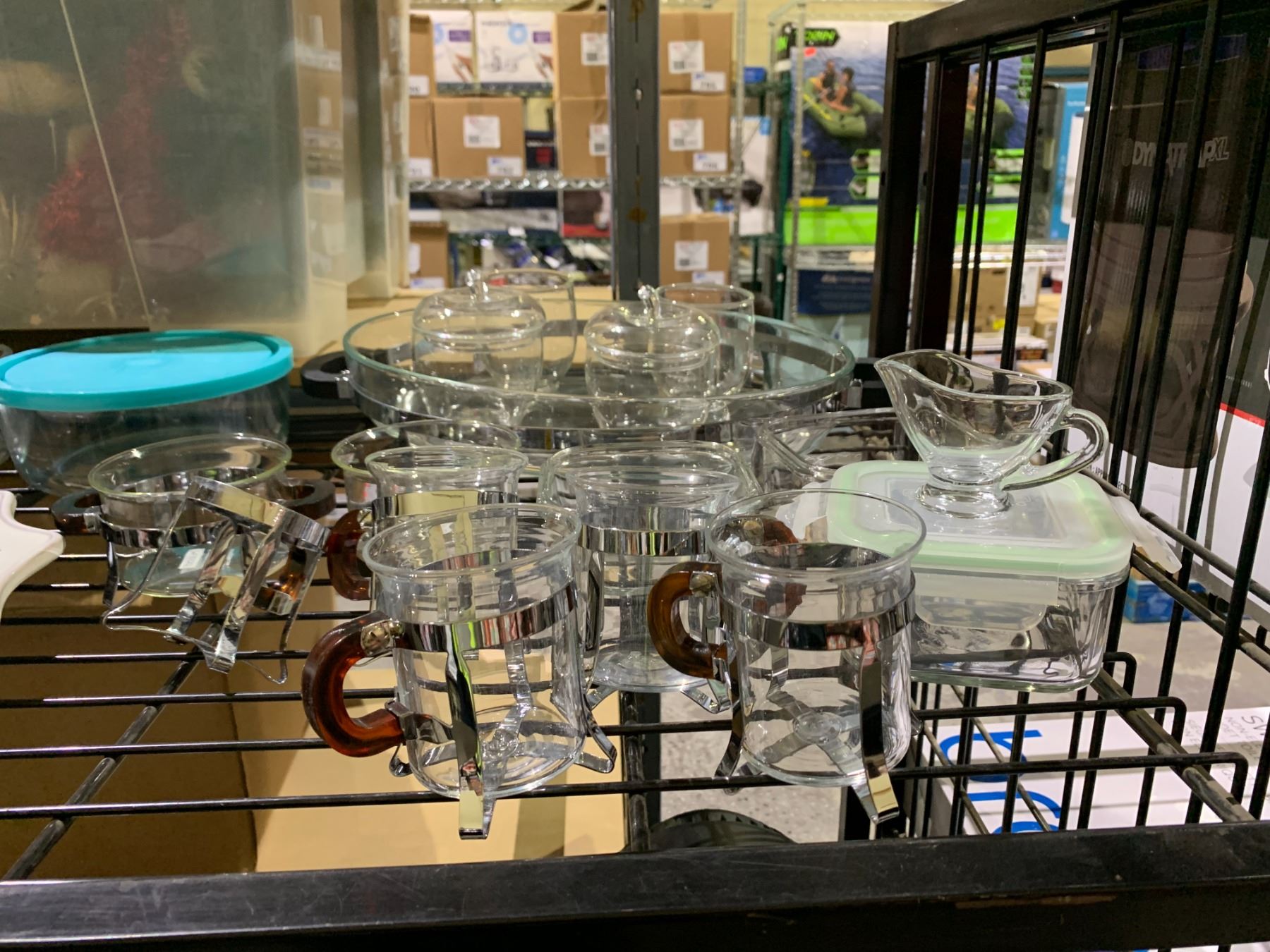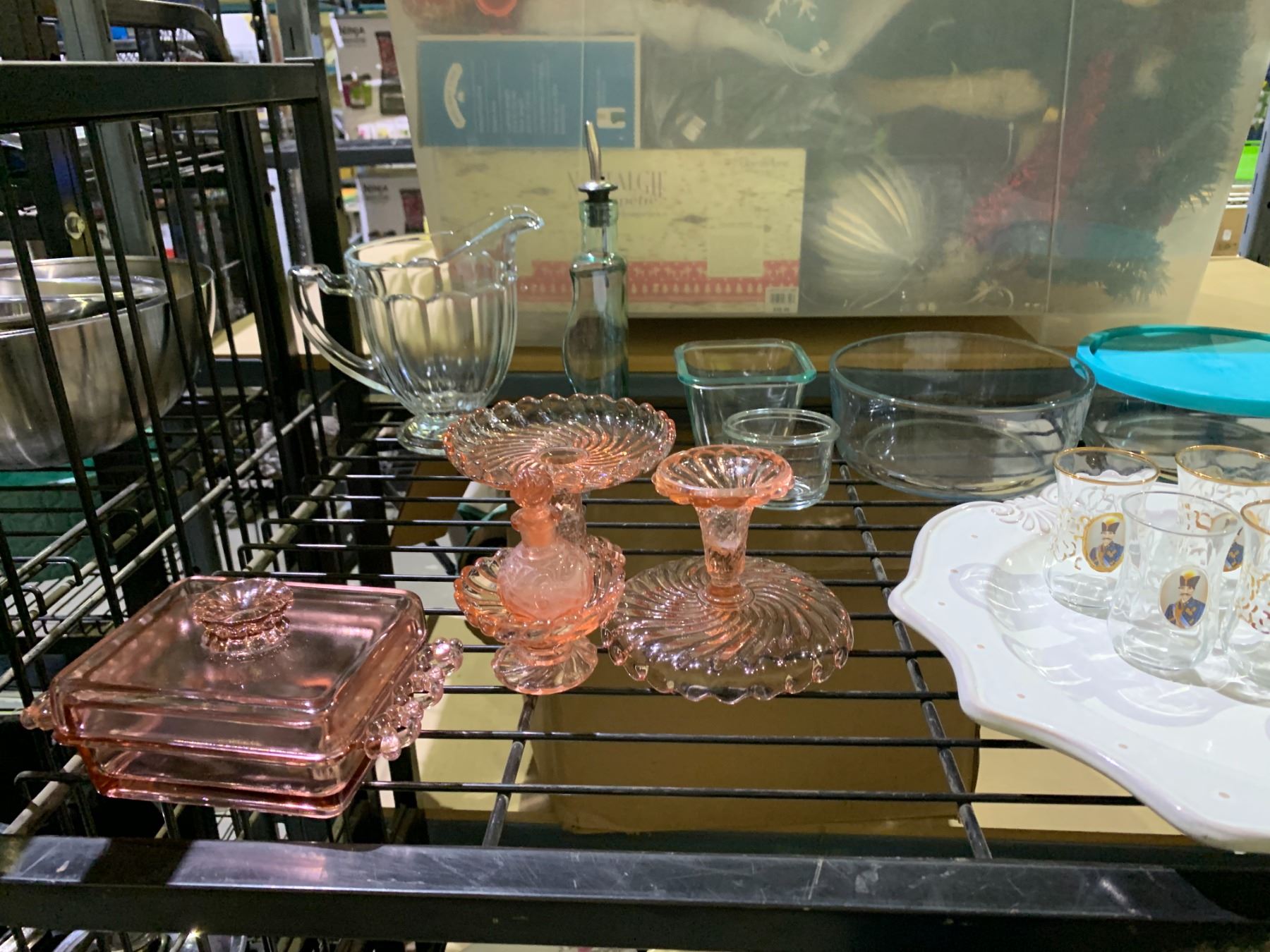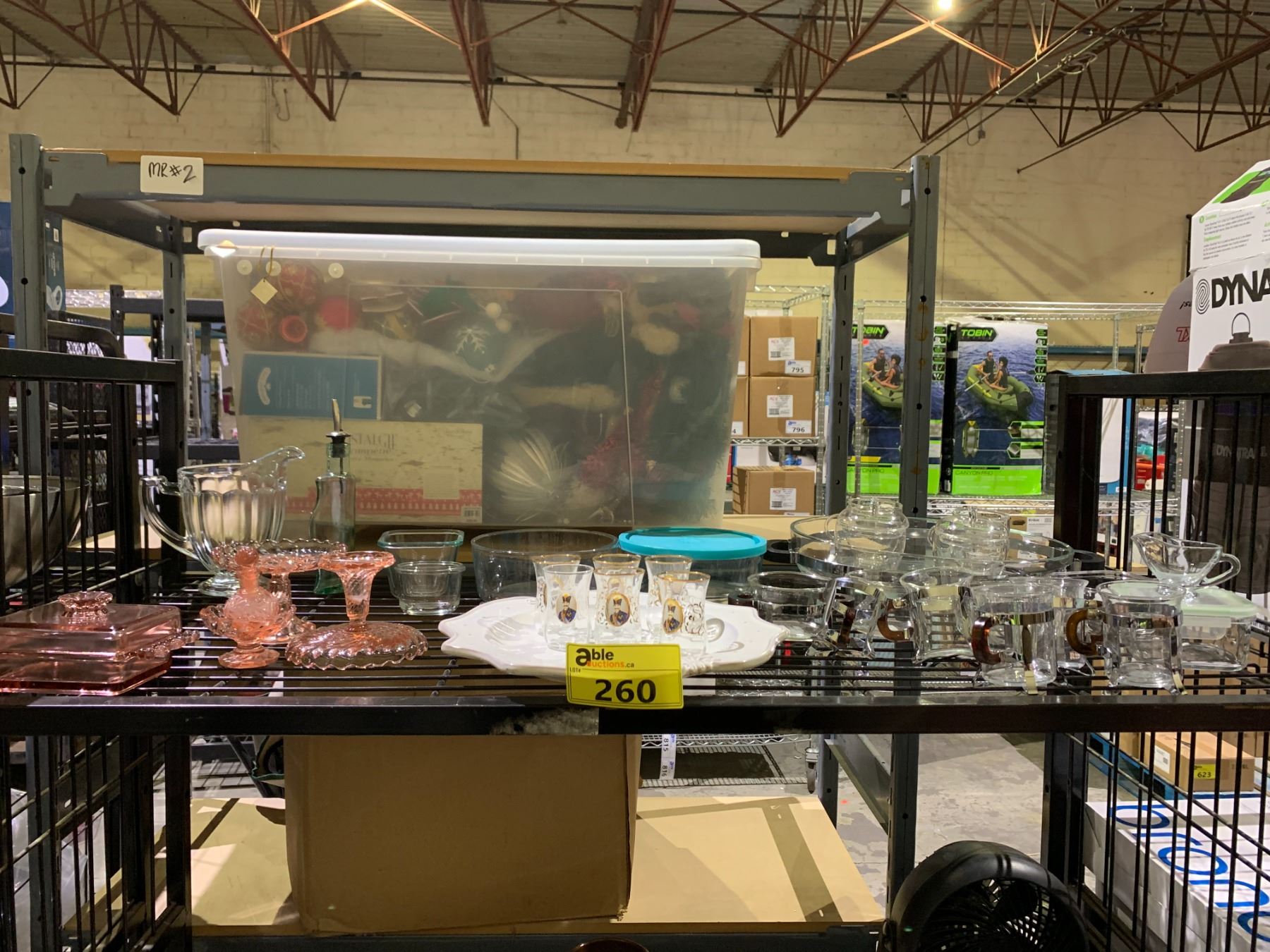 ASSORTED HOUSE WARE INCLUDING; CRANBERRY GLASS, PITCHER, CONTAINERS & MORE