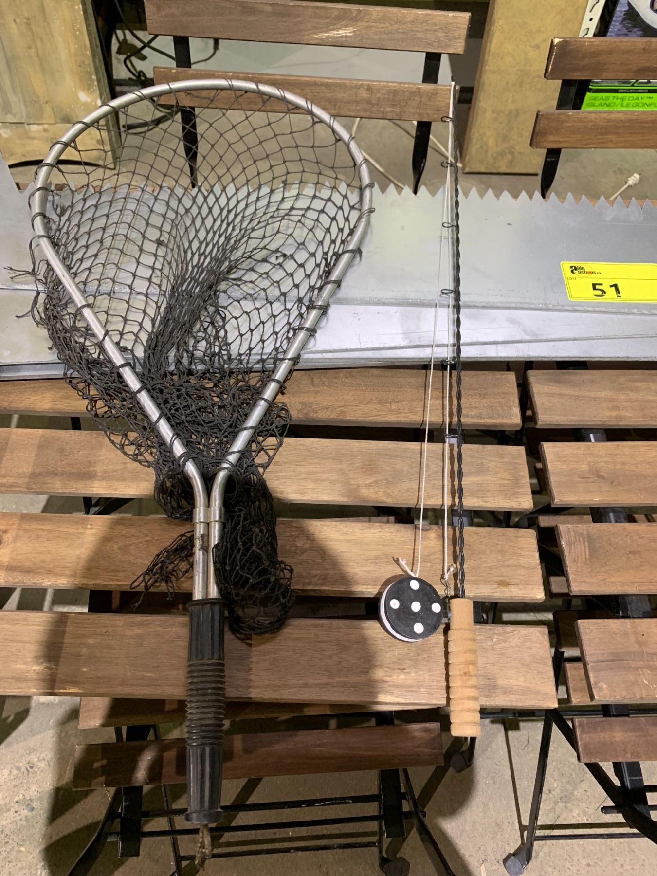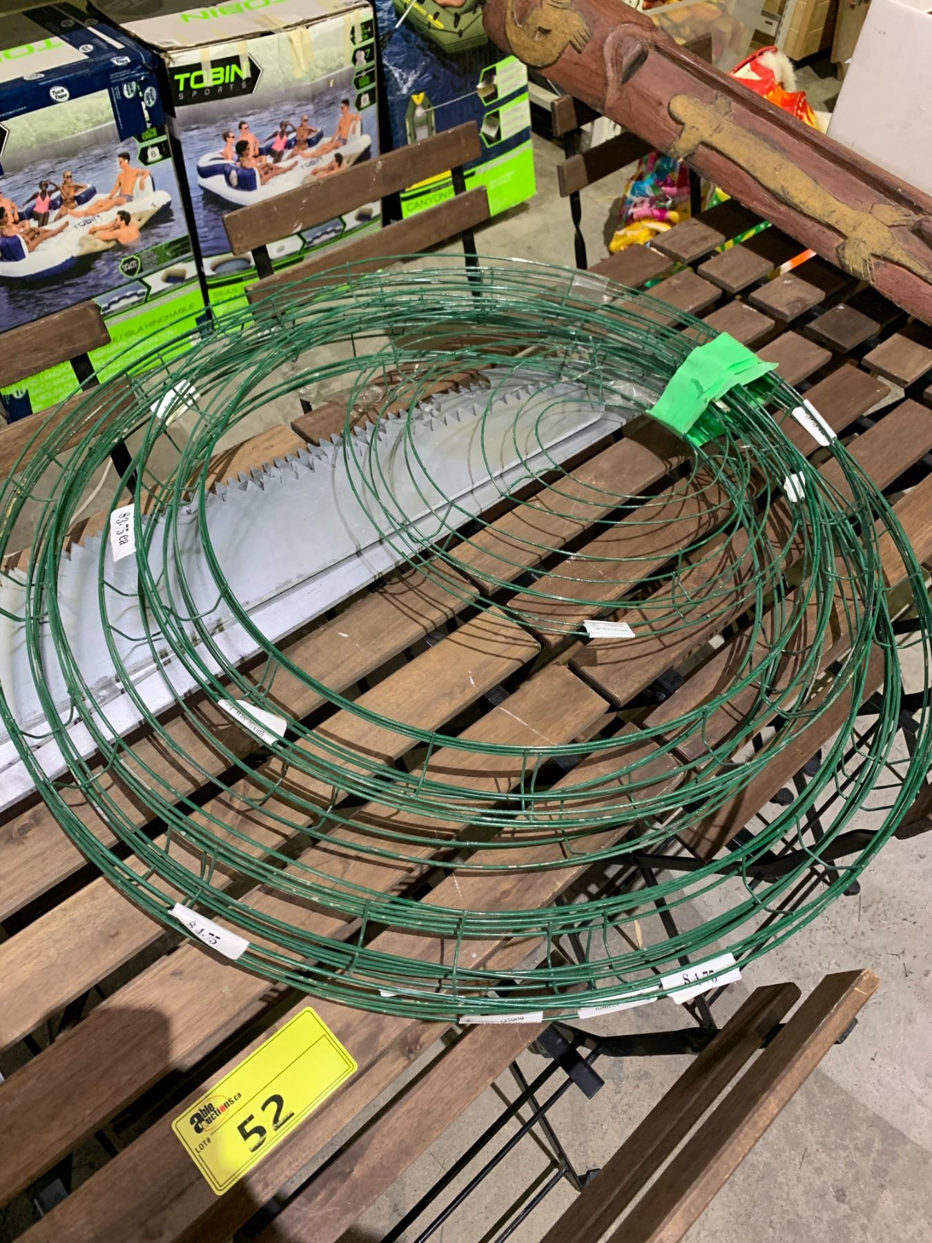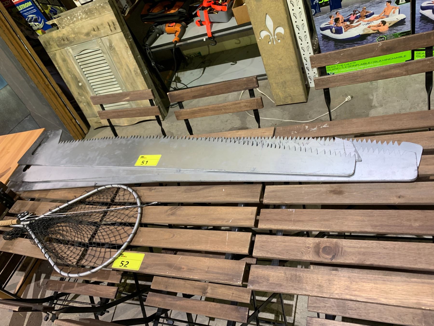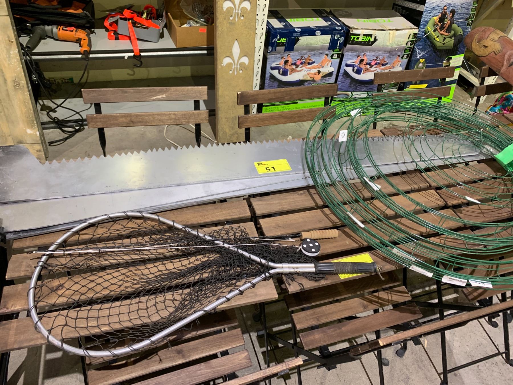 ASSORTED ITEMS INCLUDING; 5 PROP SAWS, ASSORTED SIZE WIRE WREATH FRAMES, FISHING NET & FISHING POLE PROP