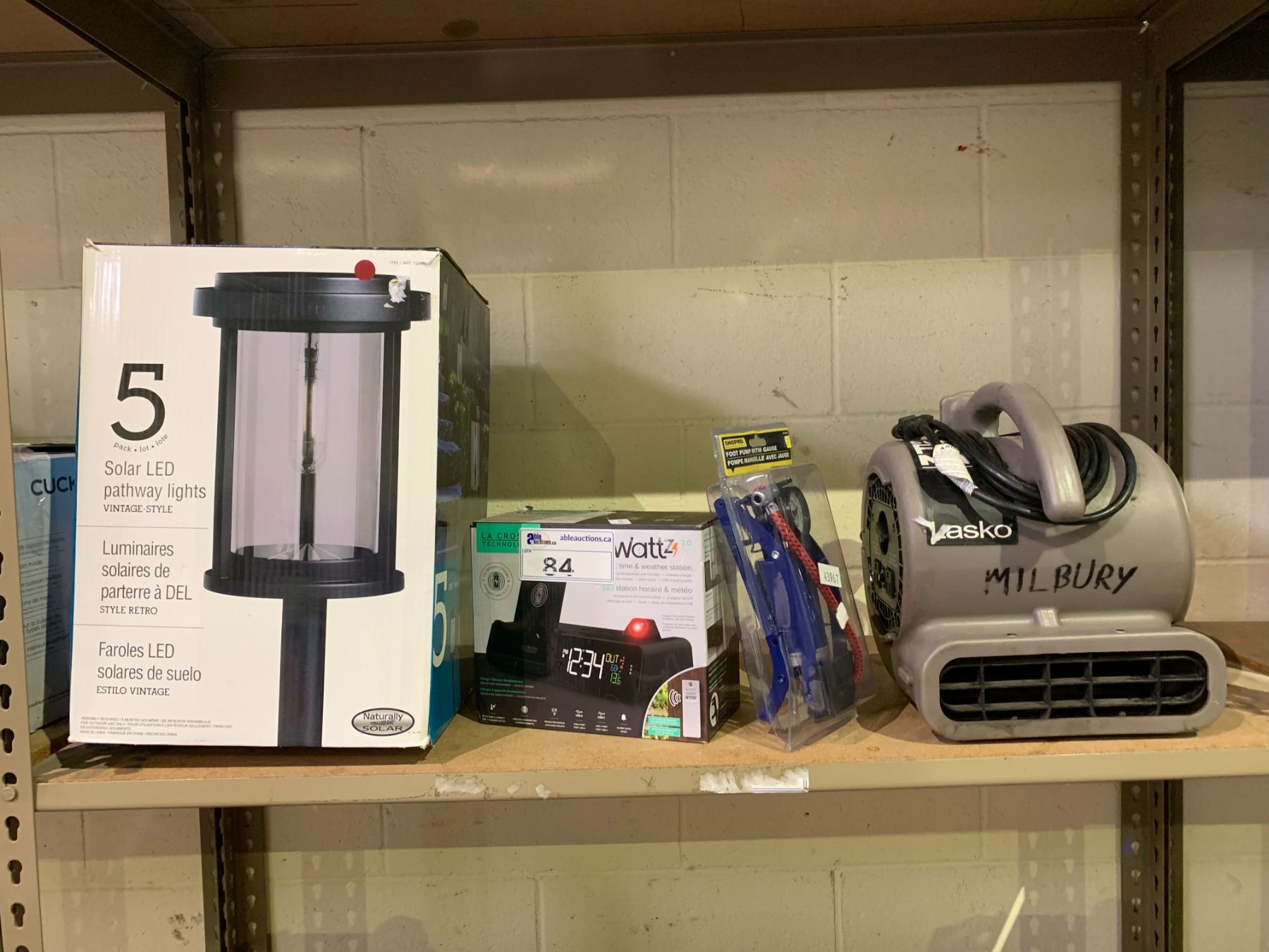 ASSORTED ITEMS INCLUDING; 5 SOLAR LED PATHWAY LIGHTS, TIME & WEATHER STATION, LASKO FLOOR FAN & MORE