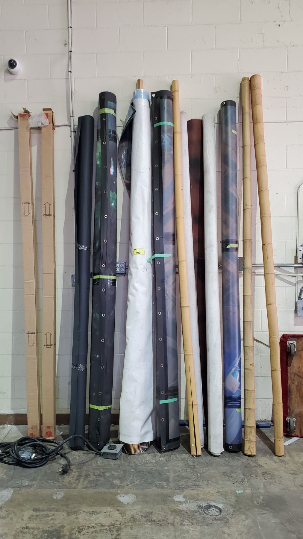 ASSORTED ITEMS INCLUDING; BAMBOO STALKS. ROLLS OF SCENIC BACKGROUNDS, ROLLS OF BLANK BACKGROUNDS & MORE