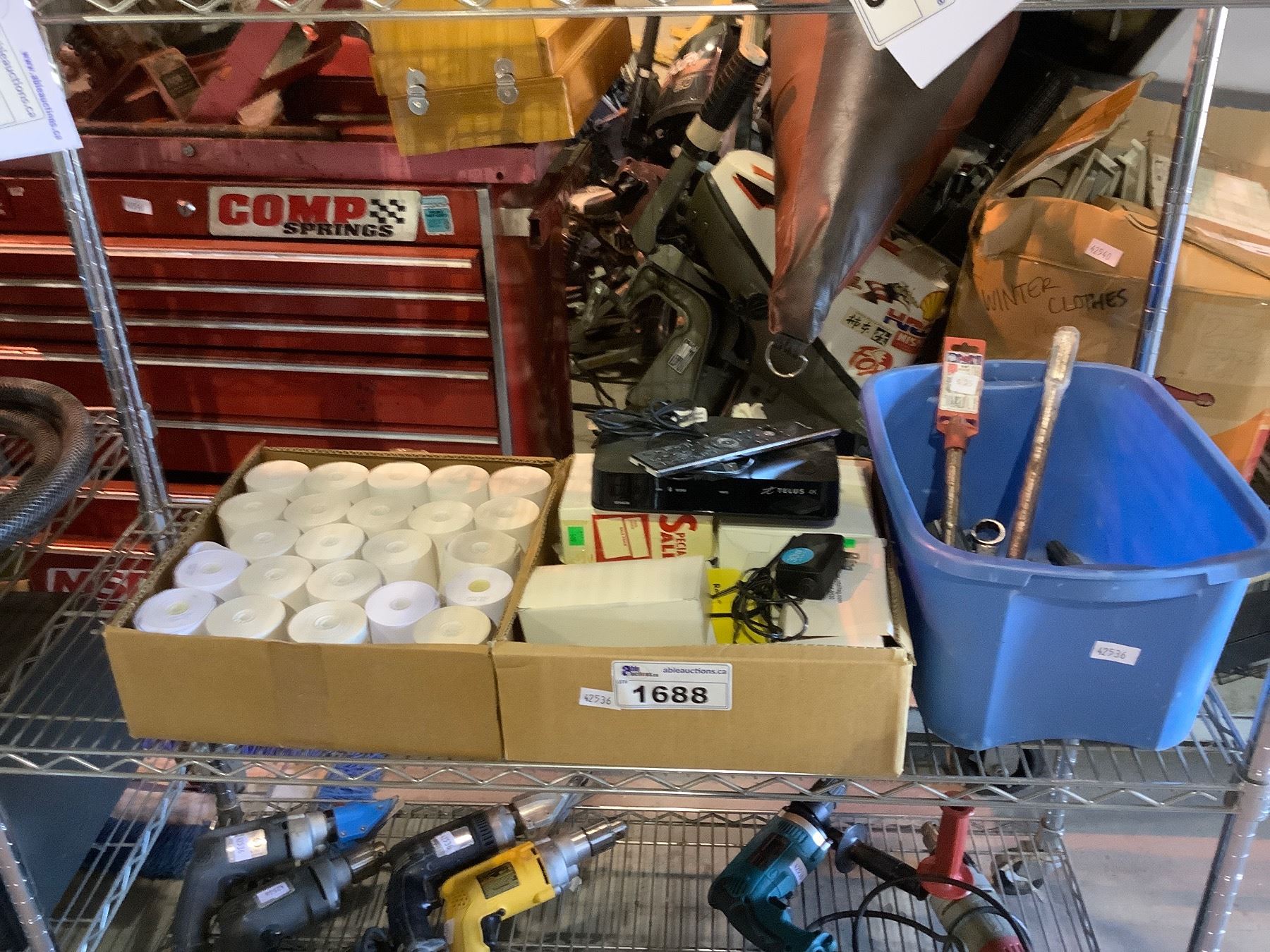 ASSORTED ITEMS INCLUDING; CALCULATOR ROLLS, STICKERS, TELUS BOX, CONCRETE DRILL BITS & MORE