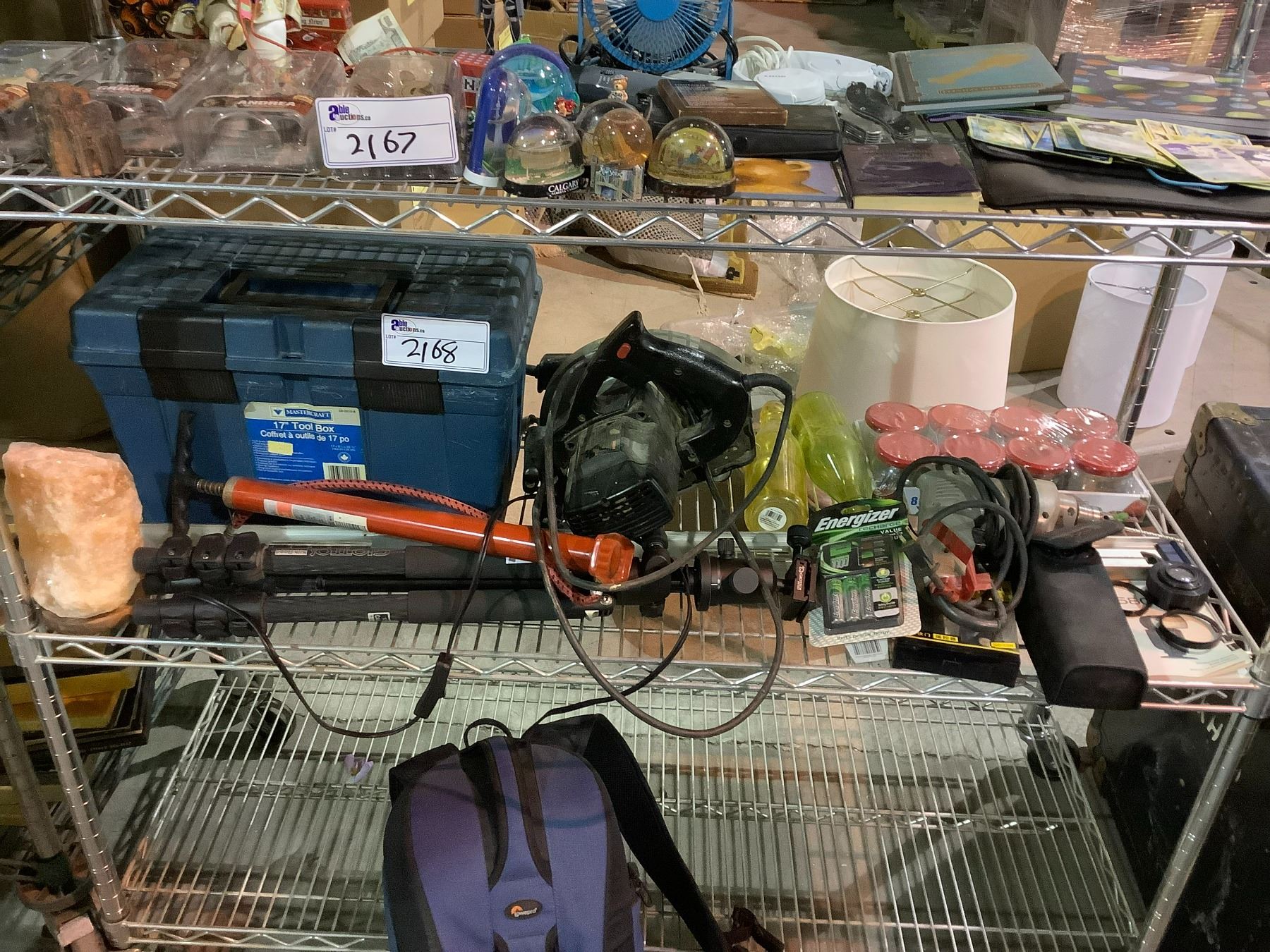 ASSORTED ITEMS INCLUDING; CIRCULAR SAW, QUARTZ LAMP, CAMERA FLASH & MORE