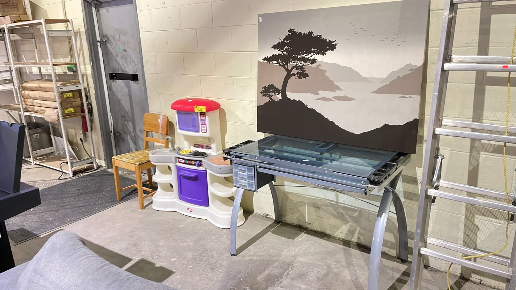 ASSORTED ITEMS INCLUDING; DESK, CANVAS ART, LITTLE TIKES KITCHEN & DINING CHAIR