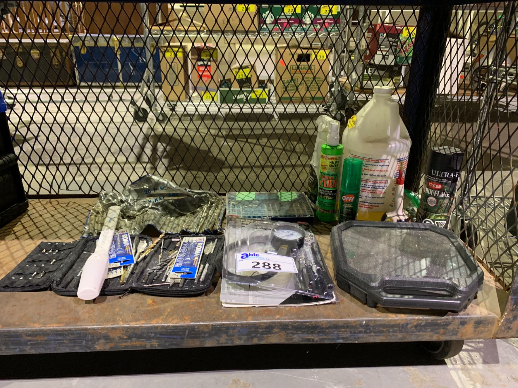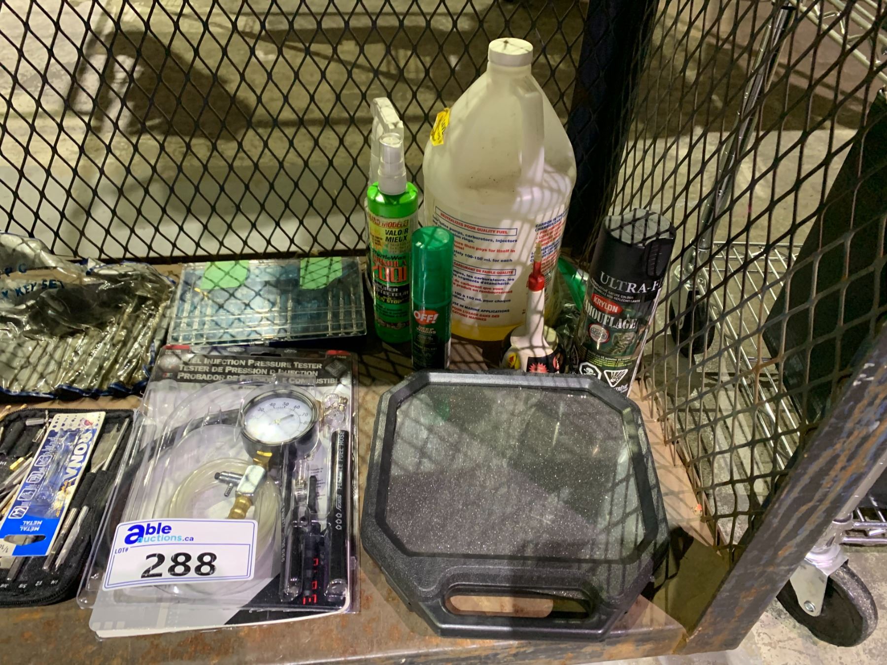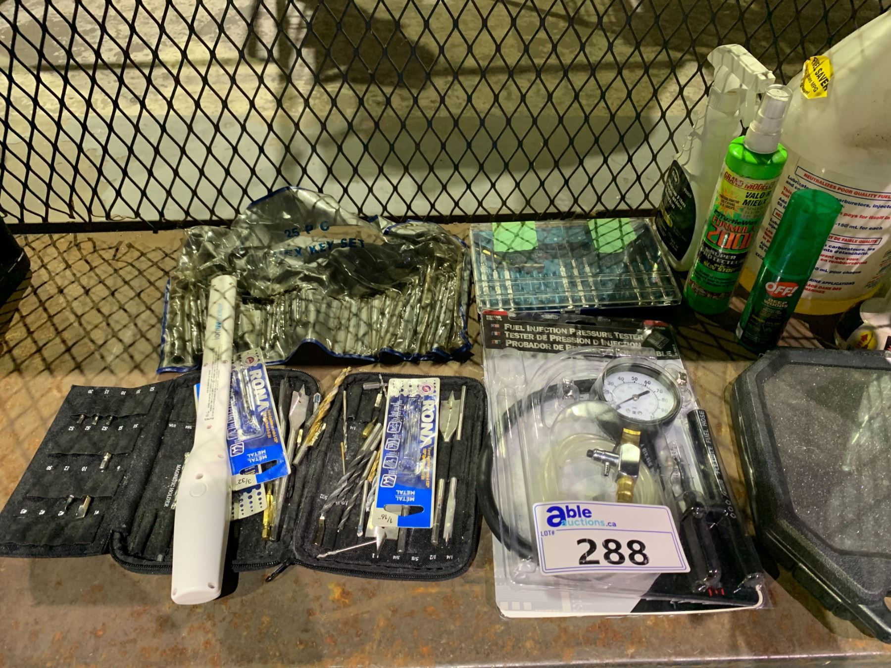 ASSORTED ITEMS INCLUDING; DRILL BITS, FUEL INJECTION PRESSURE TESTER, CAMOUFLAGES SPRAY PAINT & MORE