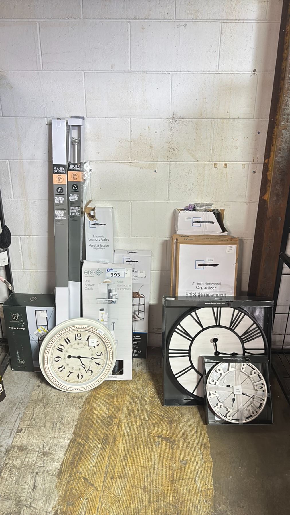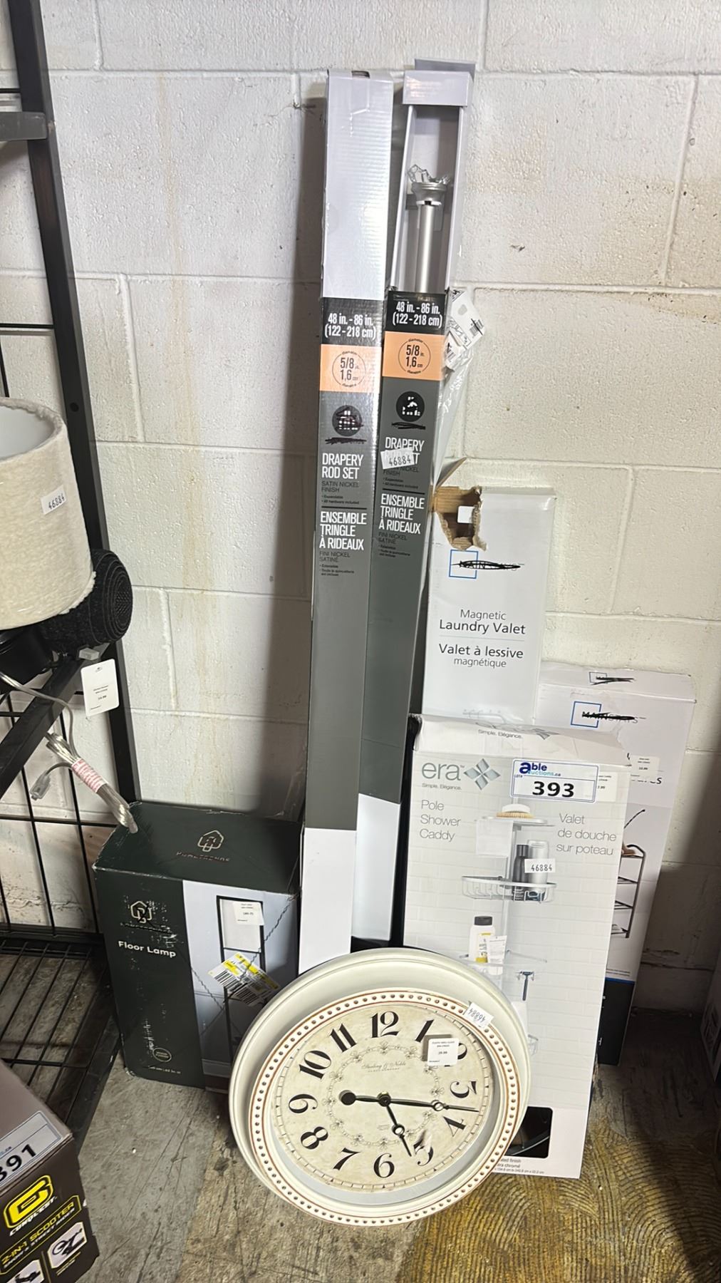ASSORTED ITEMS INCLUDING; FLOOR LAMP, DRAPERY ROD SETS, POLE SHOWER CADDY & MORE