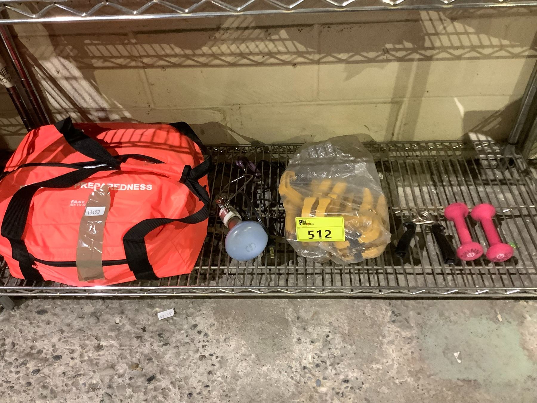 ASSORTED ITEMS INCLUDING; HAND CLIPS, DUMBBELLS, EMERGENCY PREPAREDNESS KIT & MORE