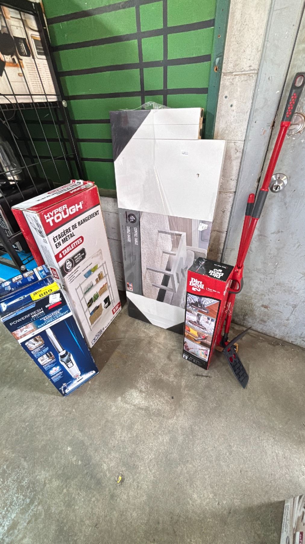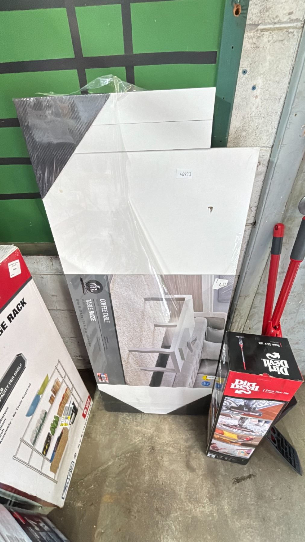 ASSORTED ITEMS INCLUDING; HYPER TOUGH METAL STORAGE RACK, BISSELL POWERFRESH DELUXE VACUUM, COFFEE TABLE & MORE