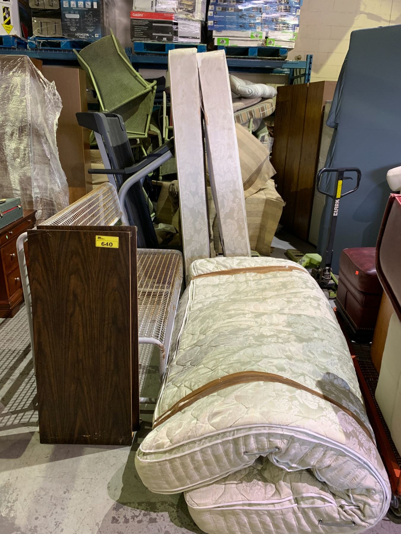 ASSORTED ITEMS INCLUDING; KING SIZE MATTRESS WITH BOX SPRINGS, METAL BENCH & 2 TABLE LEAFS