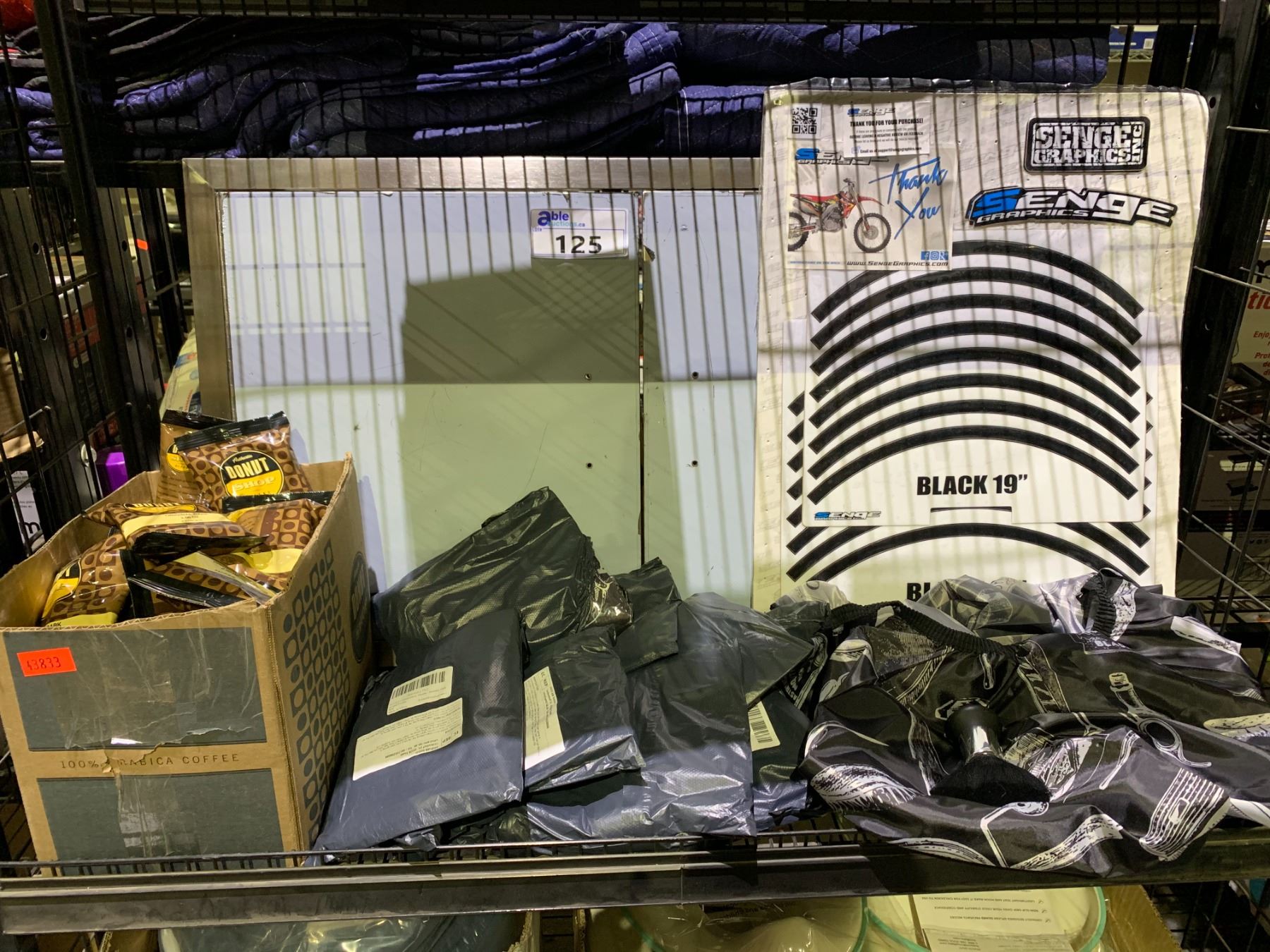 ASSORTED ITEMS INCLUDING; *NEW* BARBERS APRON & BARBERS BRUSH SETS, DIRT BIKE GRAPHICS, BOX OF AUTHENTIC DONUT SHOP BLEND ORIGINAL DARK & MORE