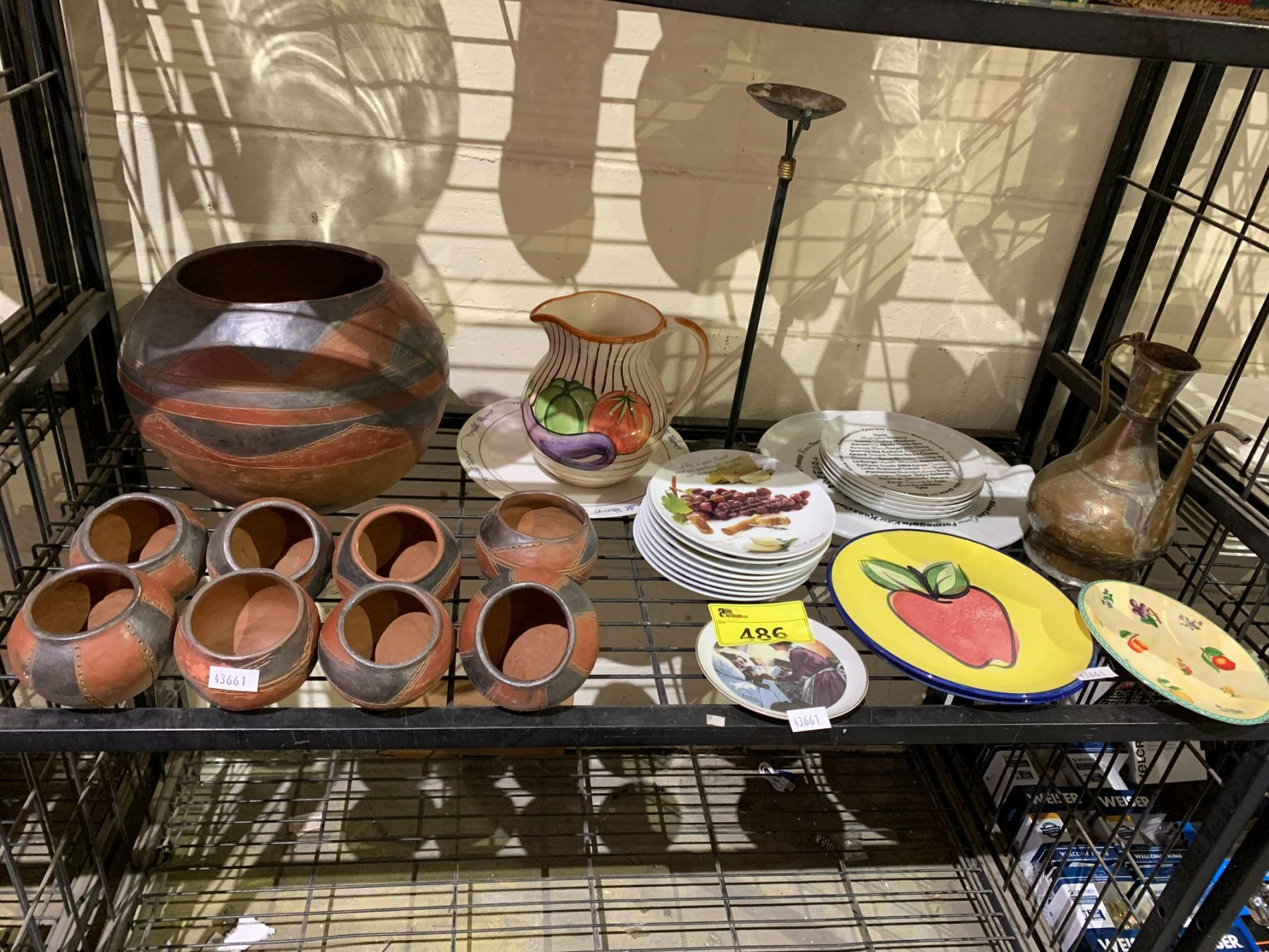 ASSORTED ITEMS INCLUDING; NORMAN ROCKWELL "MOTHER'S LOVE" PLATE, CLAY POT SET, PITCHER & MORE