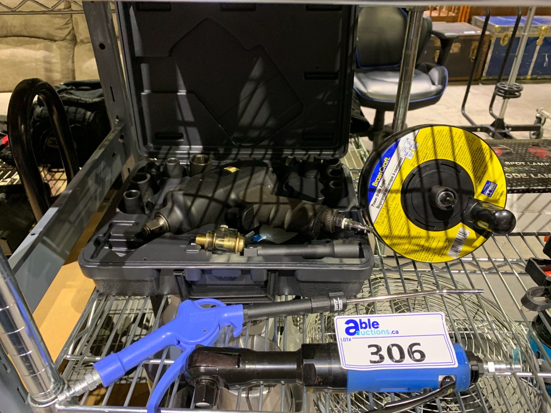 ASSORTED ITEMS INCLUDING; POWER FIST 1/2" DR. IMPACT WRENCH, BRASSCRAFT POWER DRAIN AUGUR & 2 AIR TOOLS