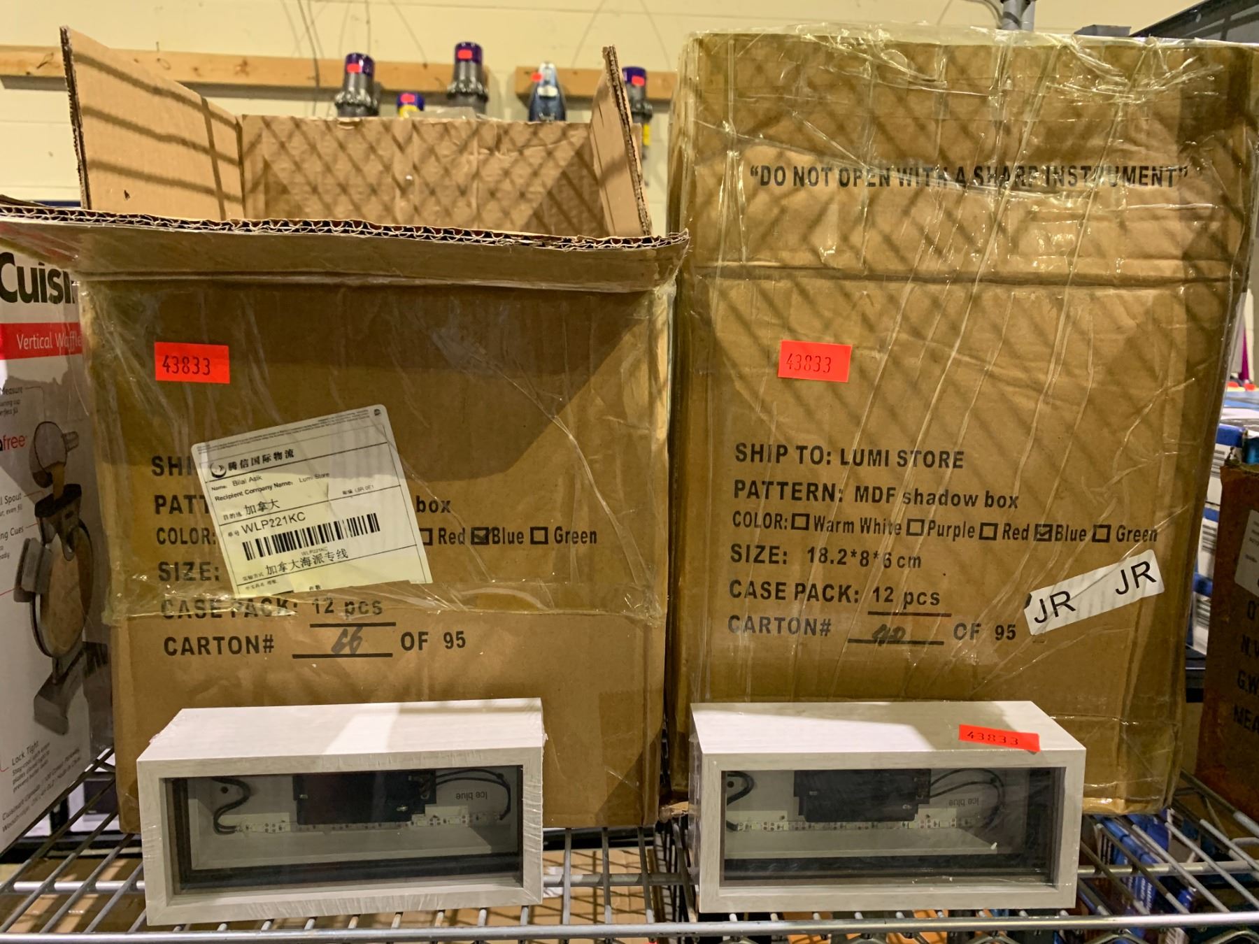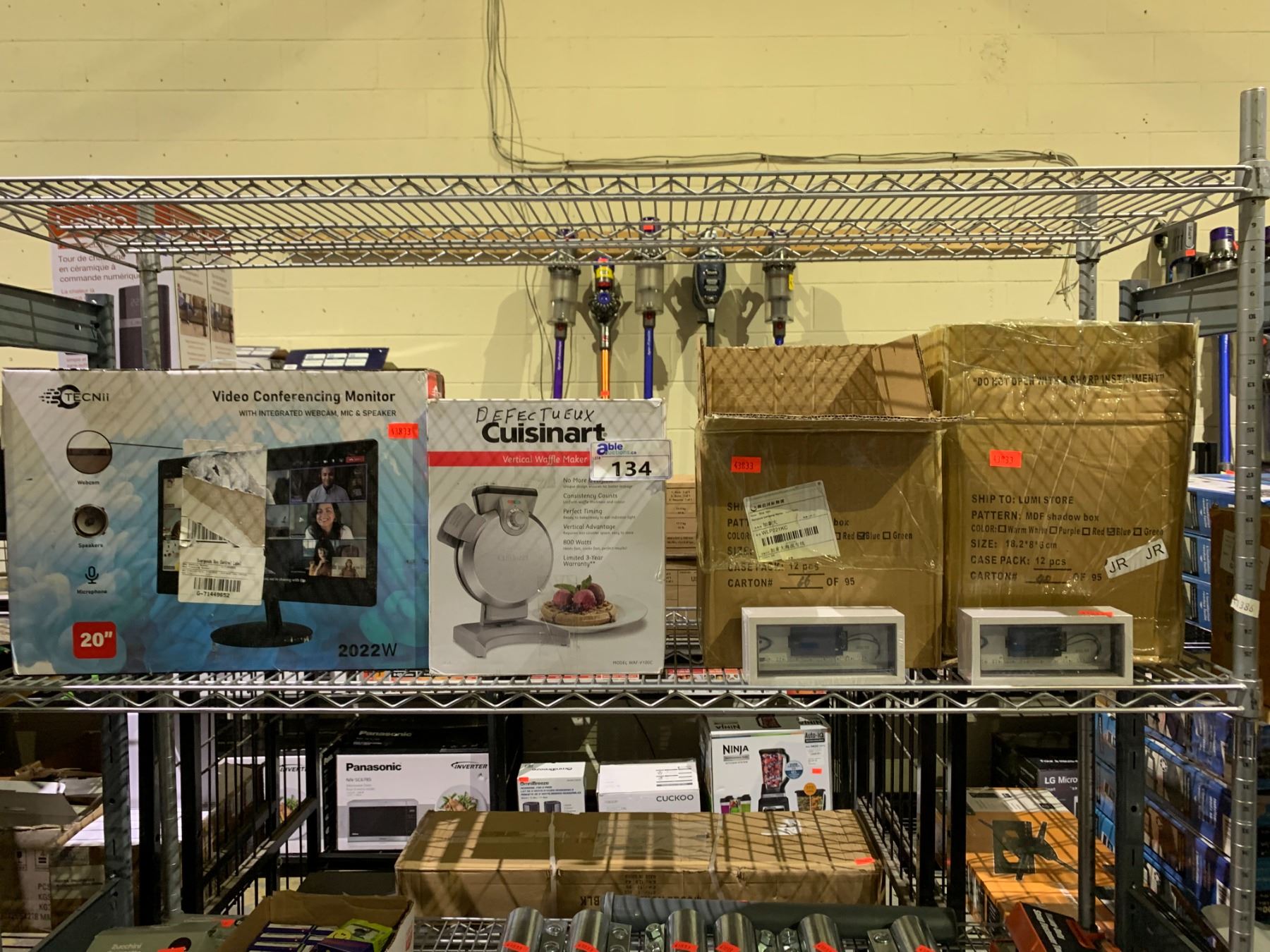 ASSORTED ITEMS INCLUDING; SMALL BACK LIT SHADOW BOXES, CUISINART VERTICAL WAFFLE MAKER & TECNII VIDEO CONFERENCING MONITOR
