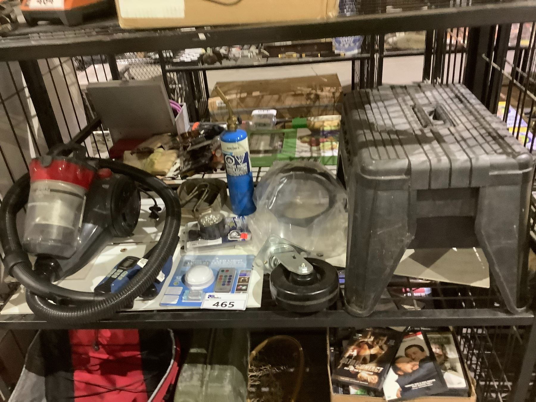 ASSORTED ITEMS INCLUDING; STEP TOOL BOX, BUTANE TORCH, DIRT DEVIL VACUUM & MORE