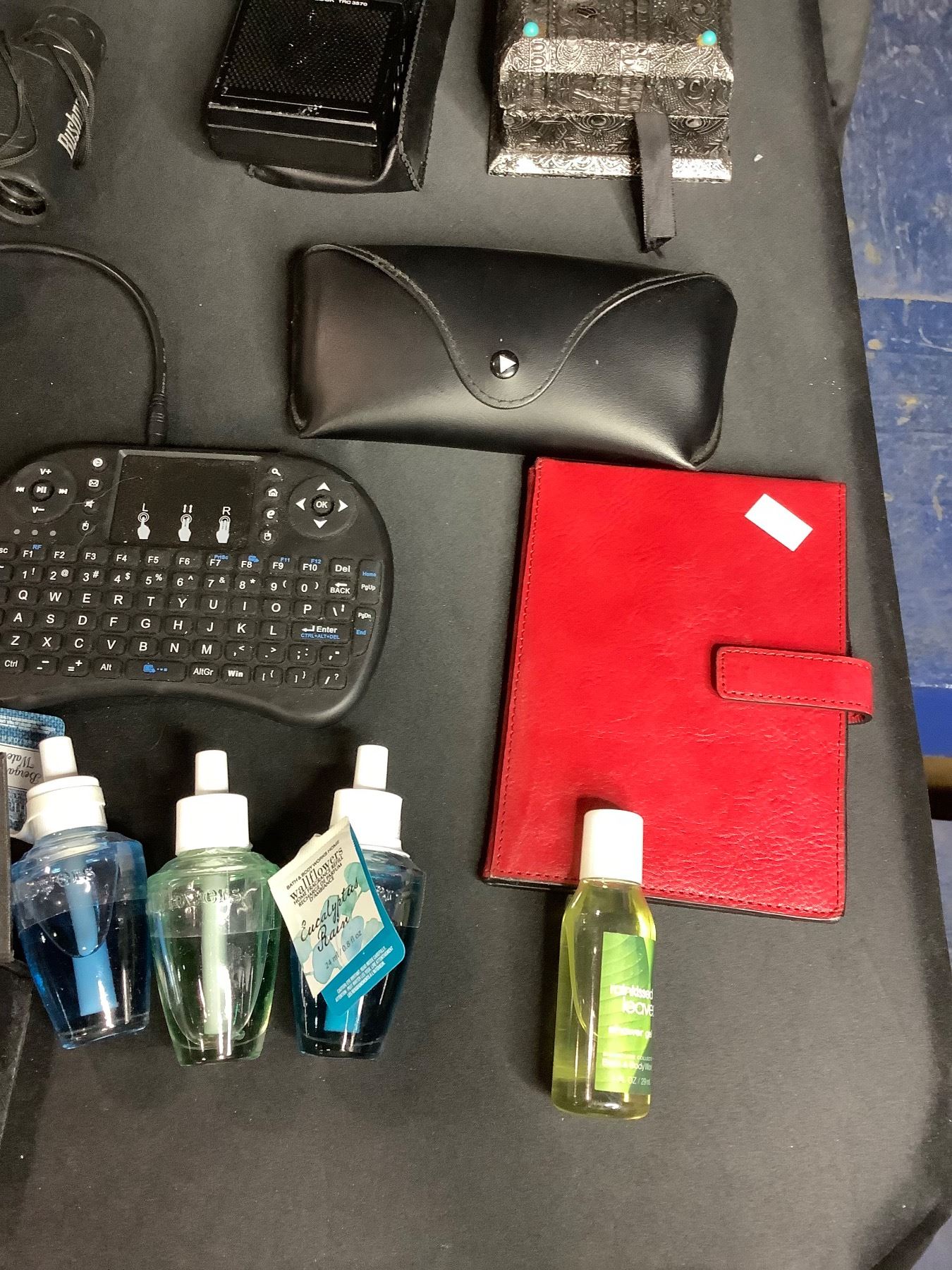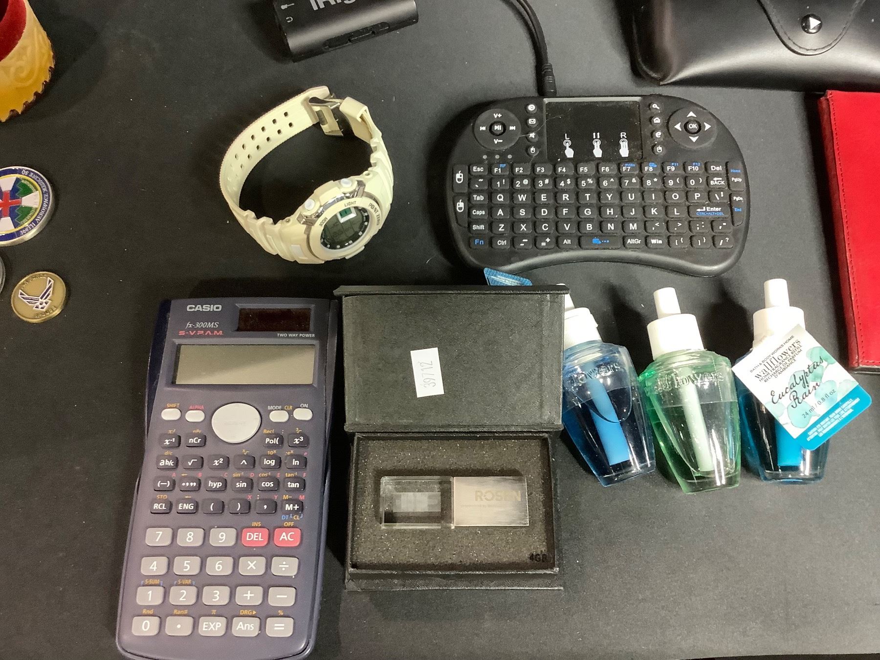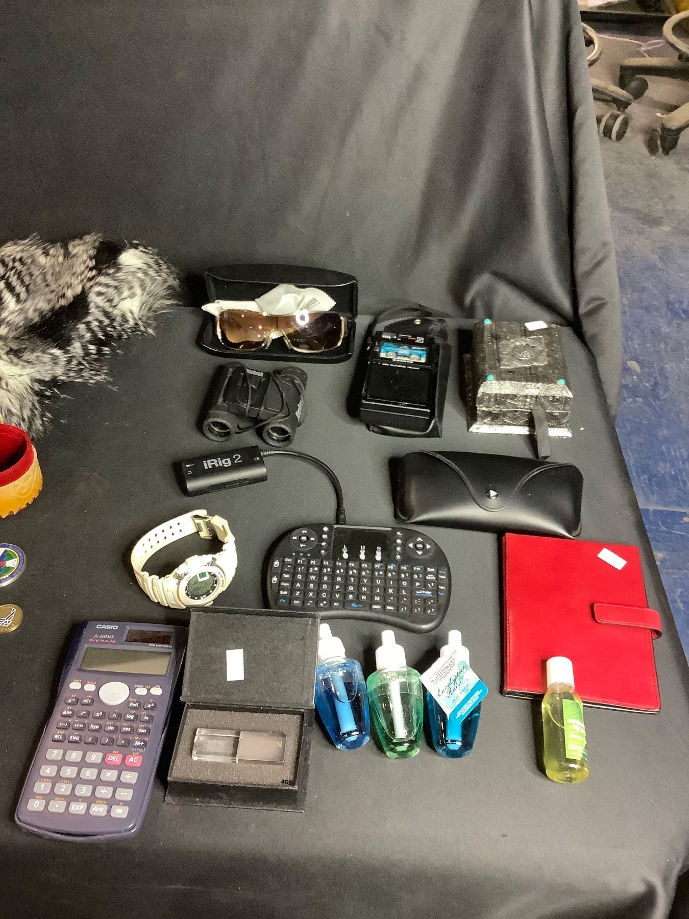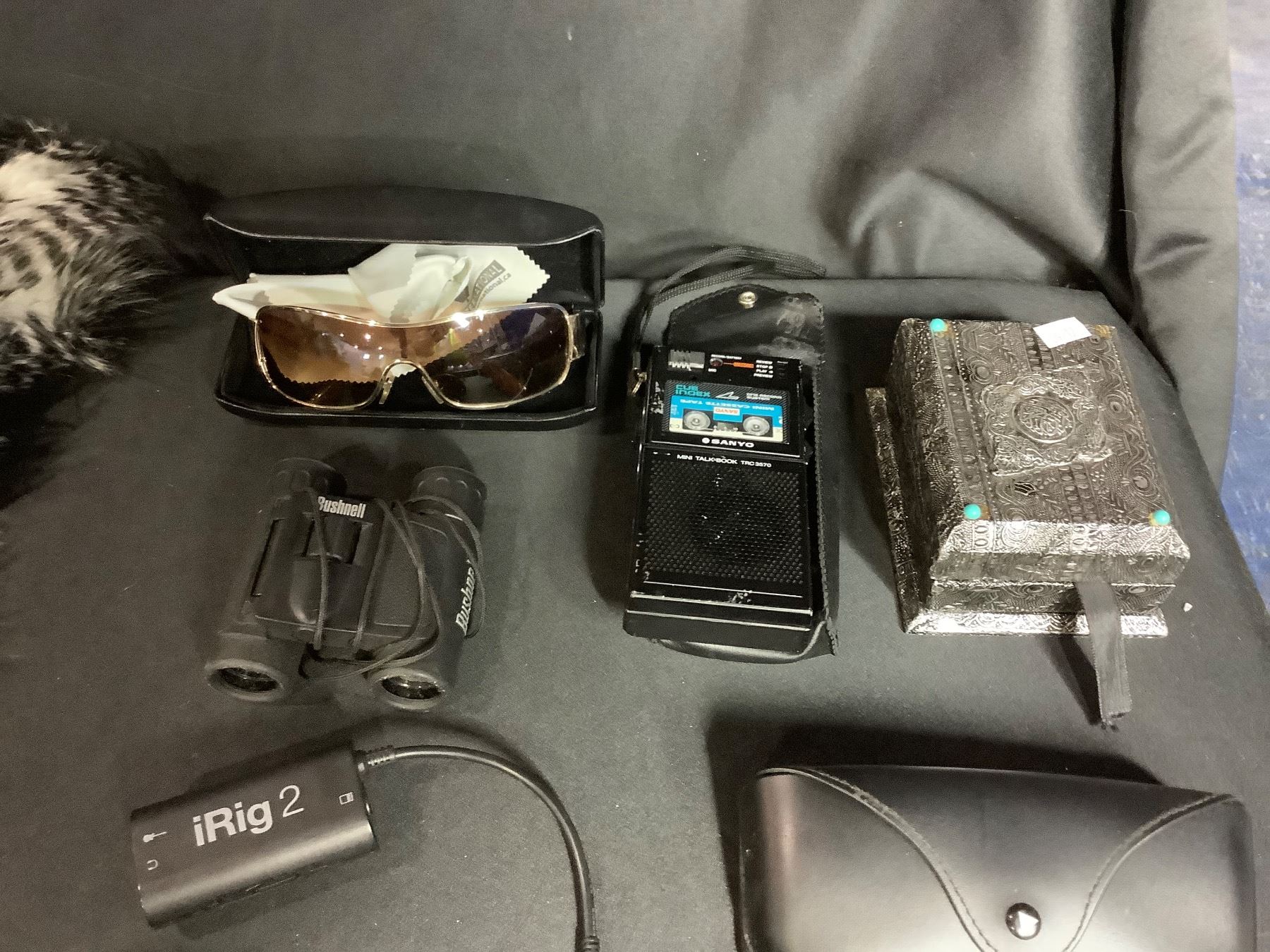 ASSORTED ITEMS: IRIG 2, DANIER LEATHER PASSPORT HOLDER, SUNGLASSES, BUSHNELL BINOCULARS, & MORE