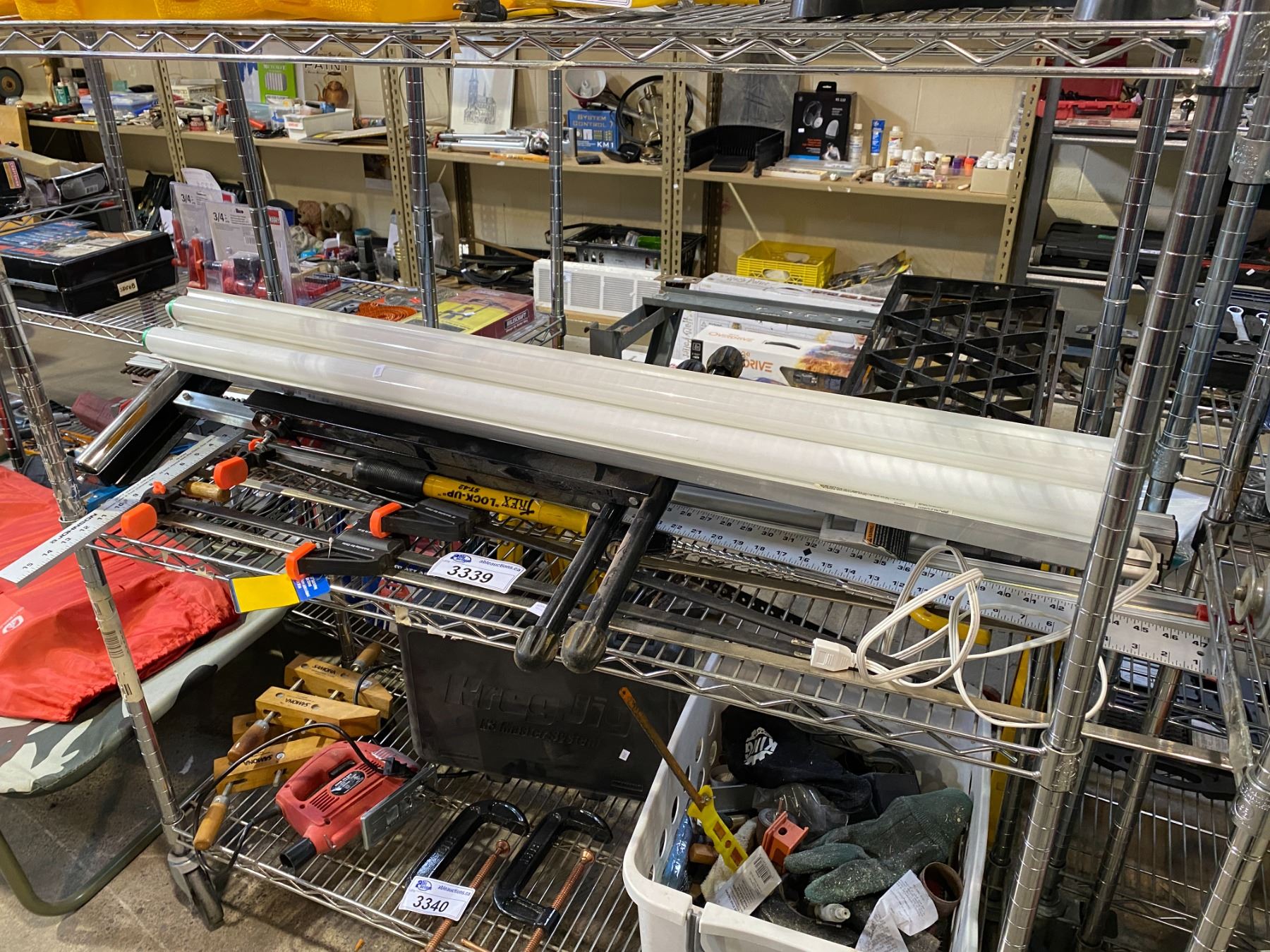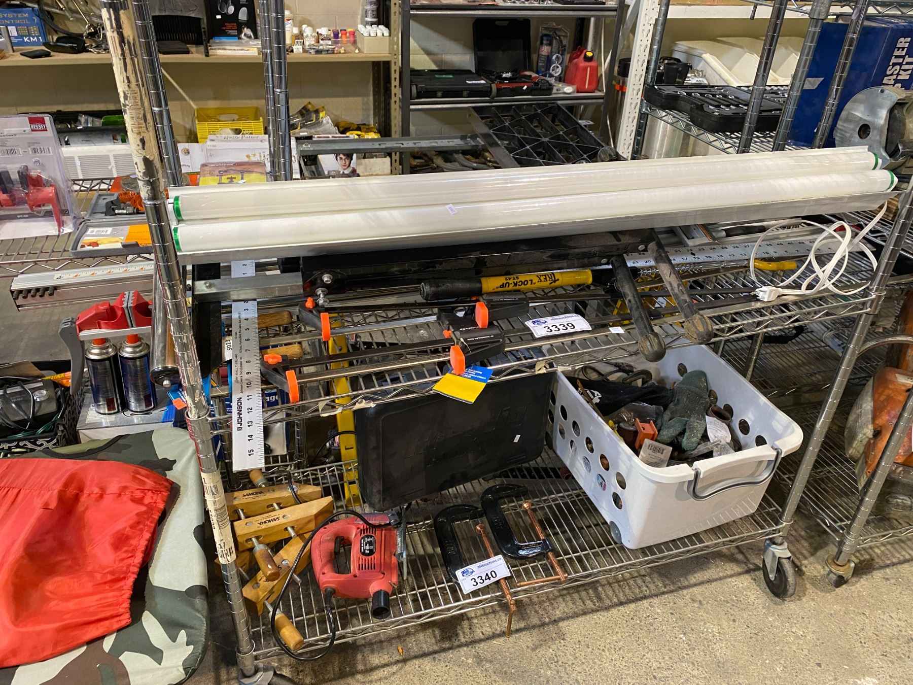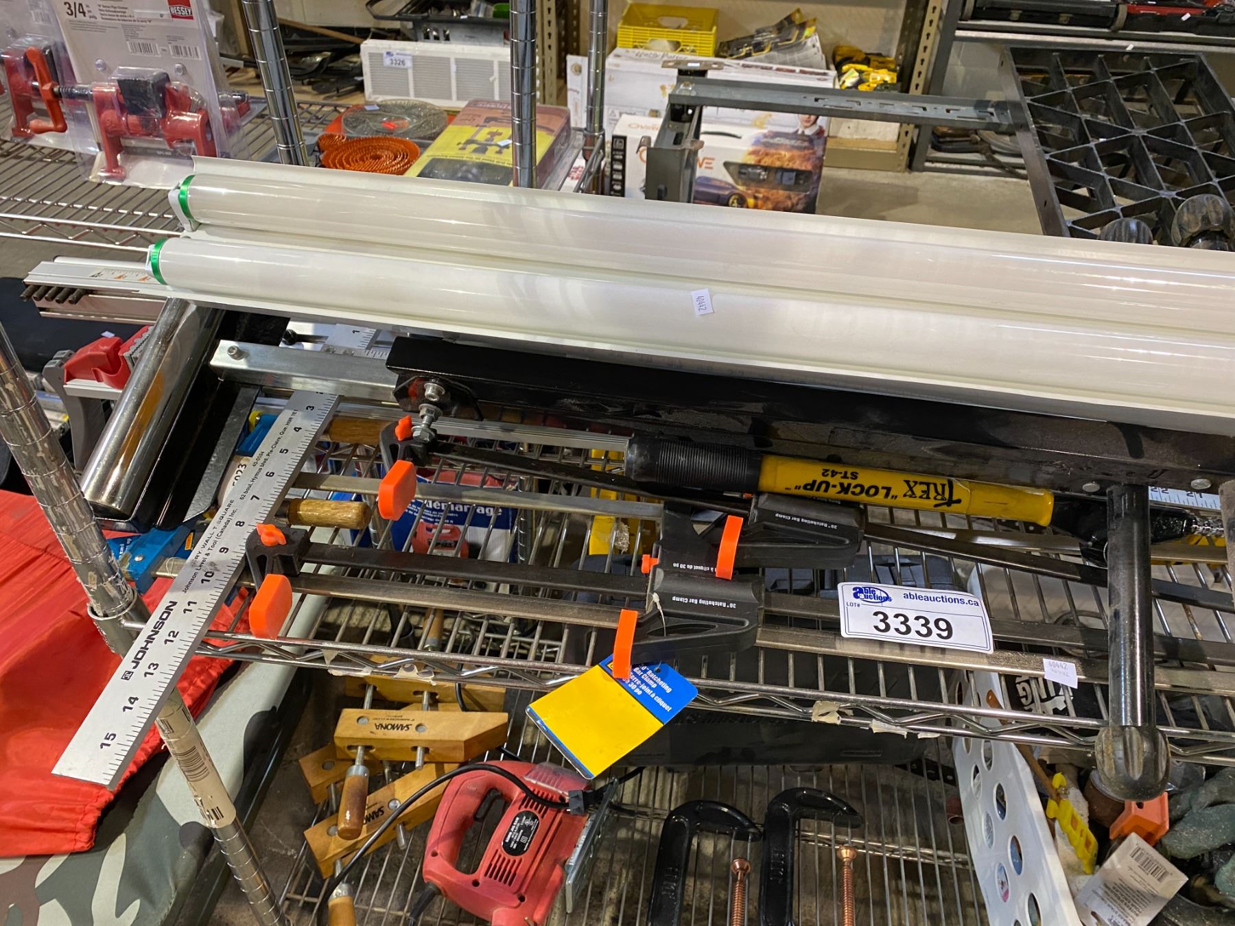 ASSORTED LONG CLAMPS, LIGHT, ROLLER STAND, & MORE