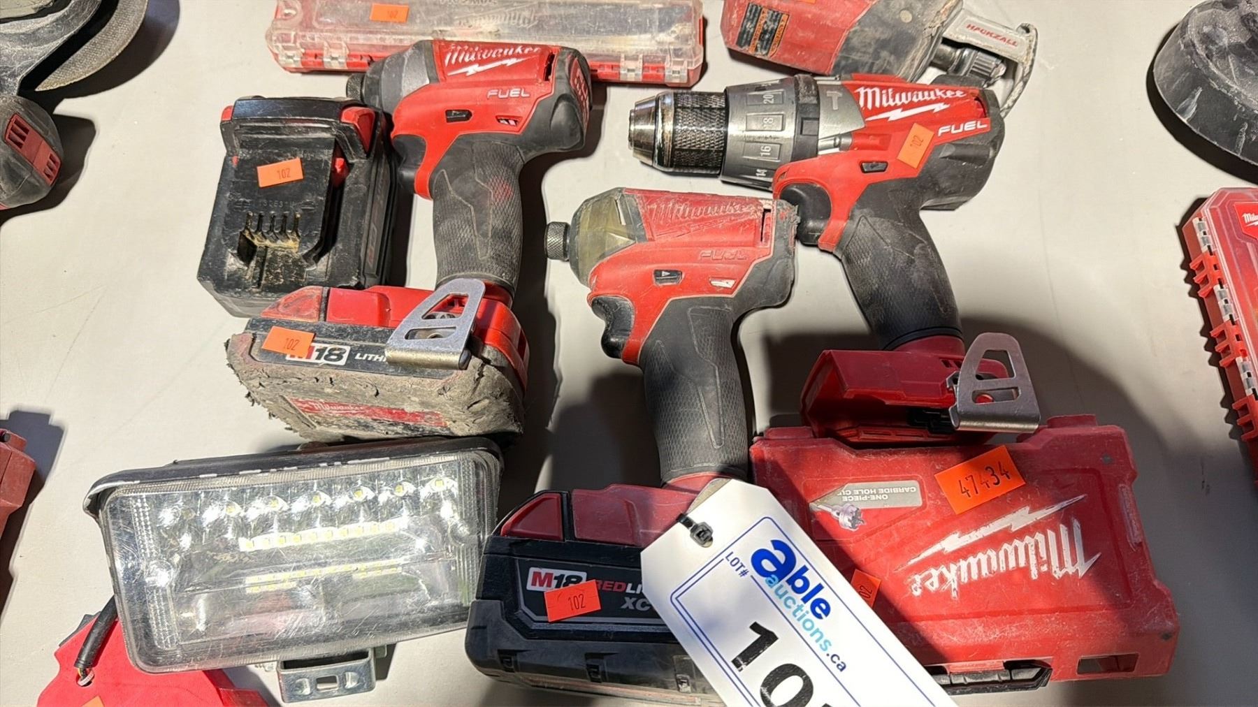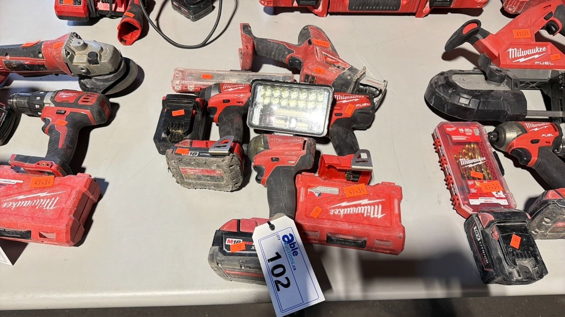 ASSORTED MILWAUKEE M18 CORDLESS POWER TOOLS INCLUDING: MILWAUKEE DRILL, MILWAUKEE IMPACT GUN,