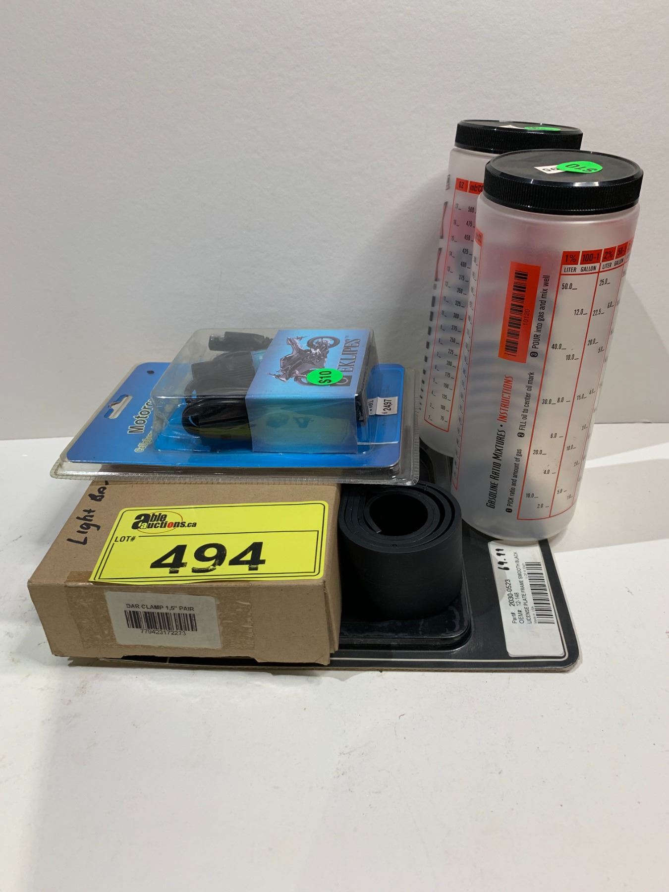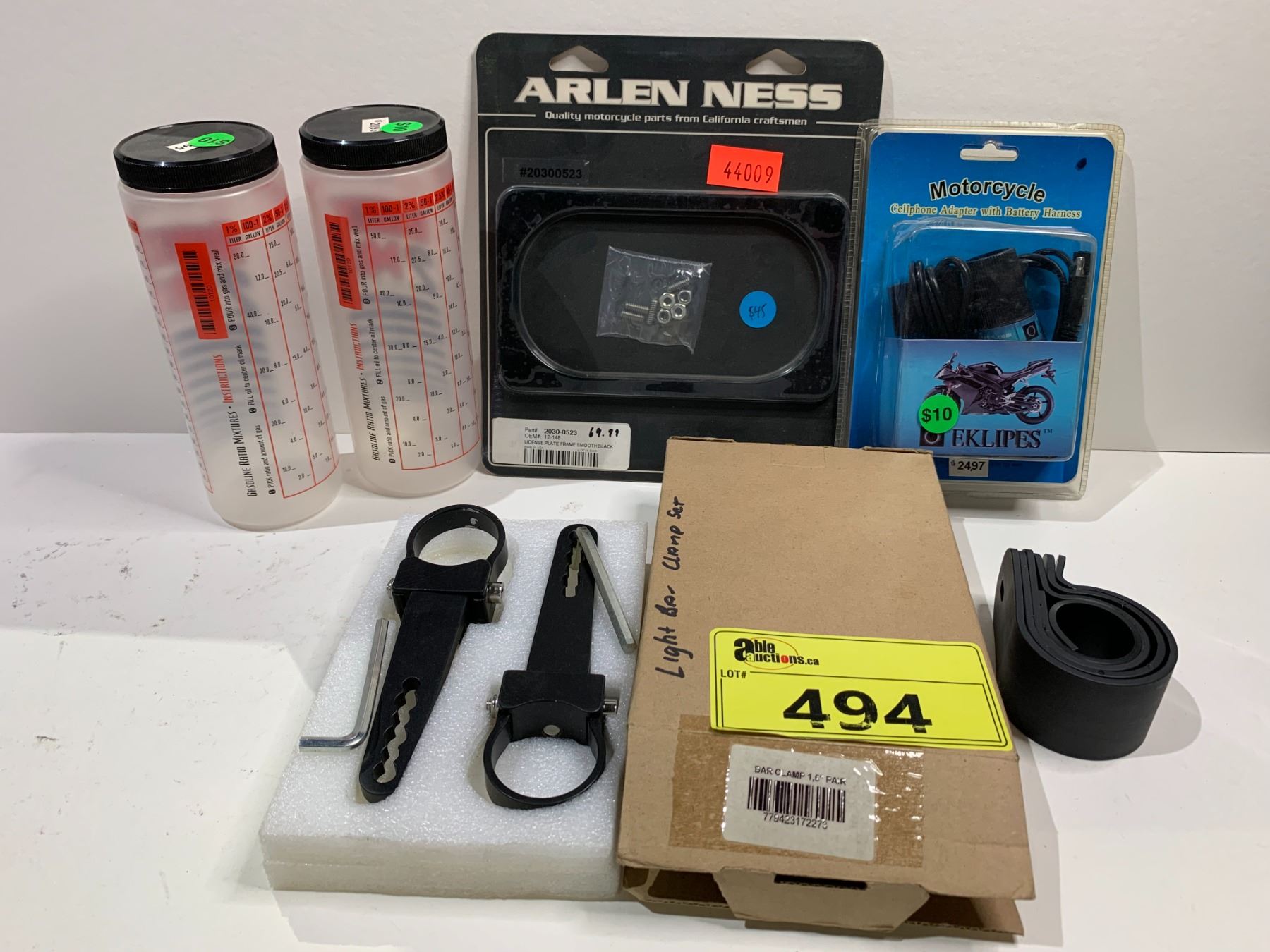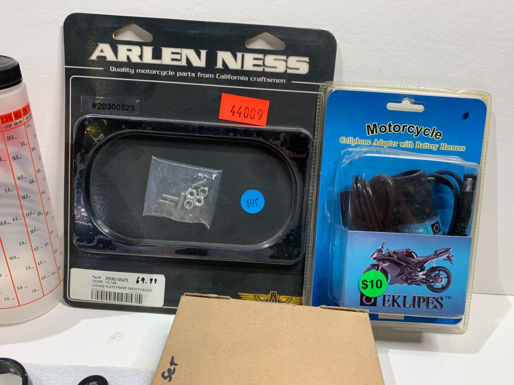 ASSORTED MOTORCYCLE PARTS INCLUDING; LIGHT BAR CLAMP SET, CELLPHONE ADAPTER WITH BATTERY HARNESS, LICENSE PLATE FRAME SMOOTH BLACK & MORE