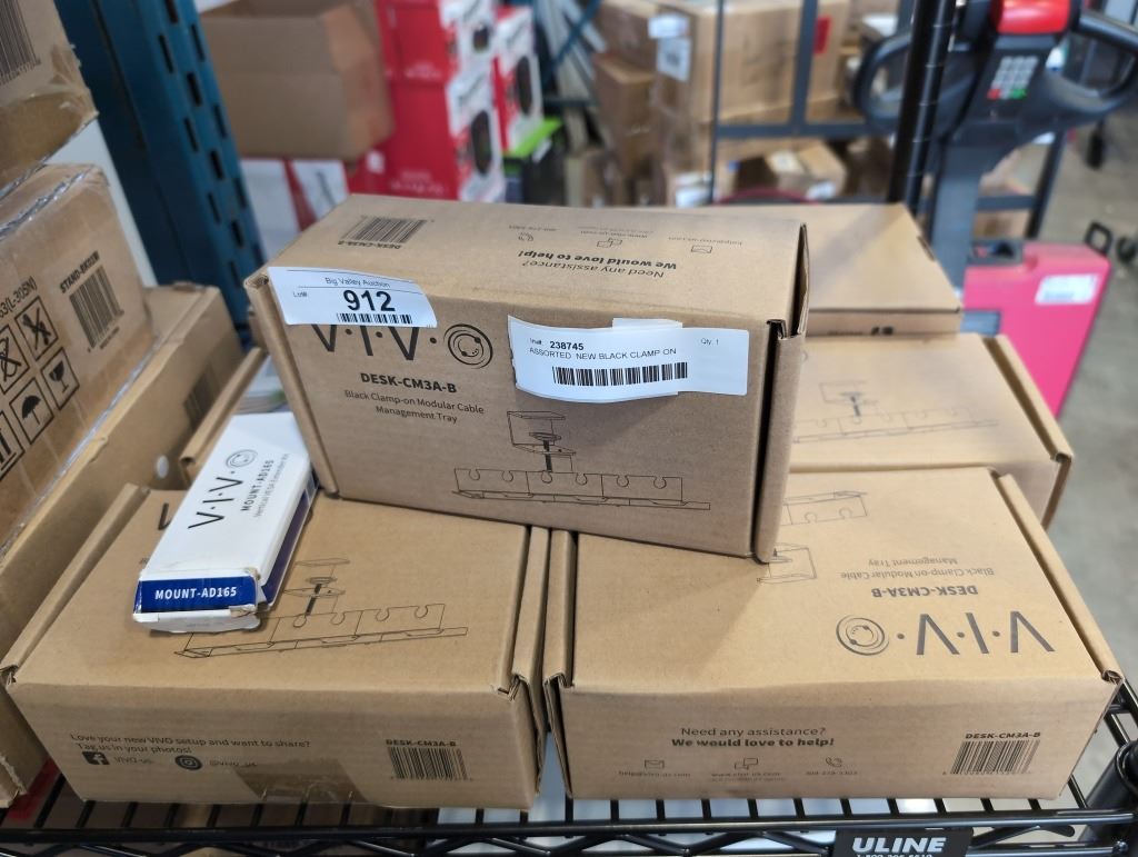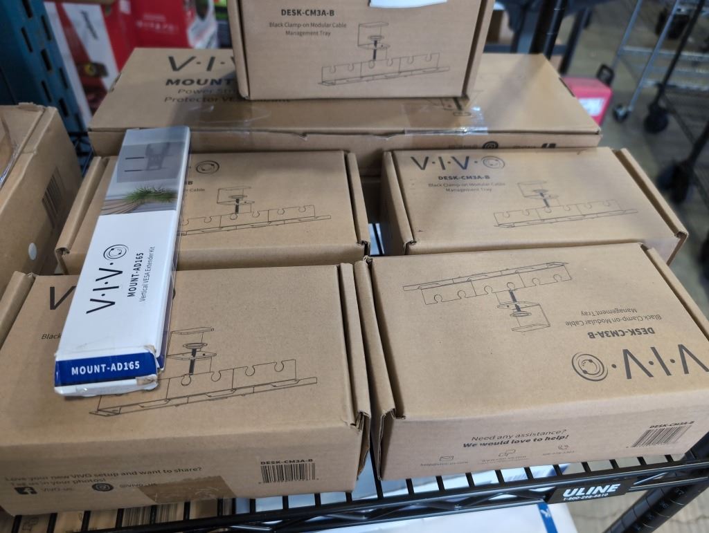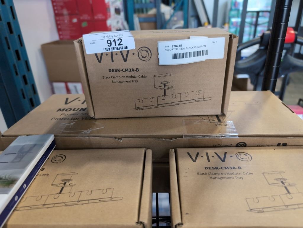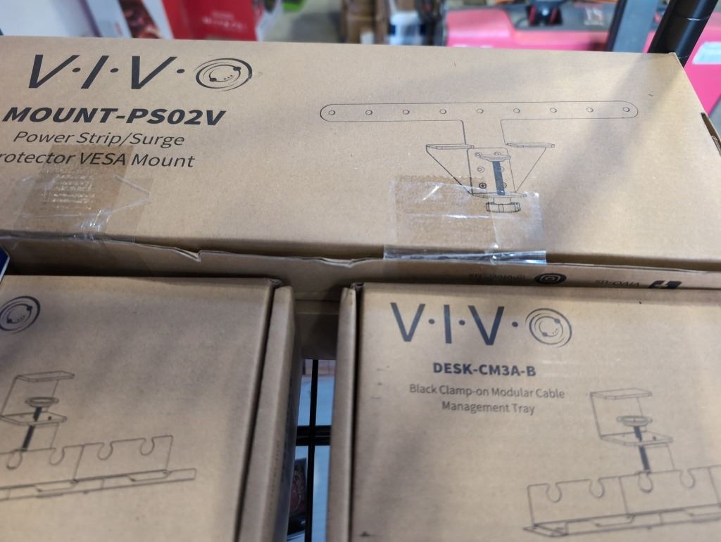 ASSORTED NEW BLACK CLAMP ON MODULAR CABLE MANAGEMENT TRAYS AND NEW VESA SURGE POROTECTOR POWER STRIP MOUNTS