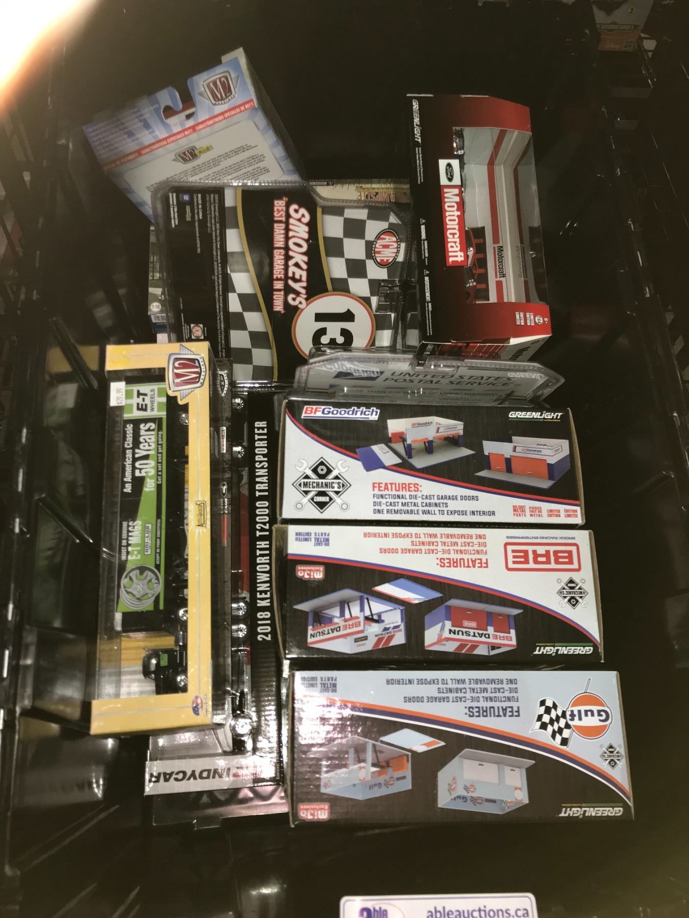 ASSORTED NEW IN PACKAGING TOY CARS (GREENLIGHT, M2) & GARAGES (BIN NOT INCLUDED)