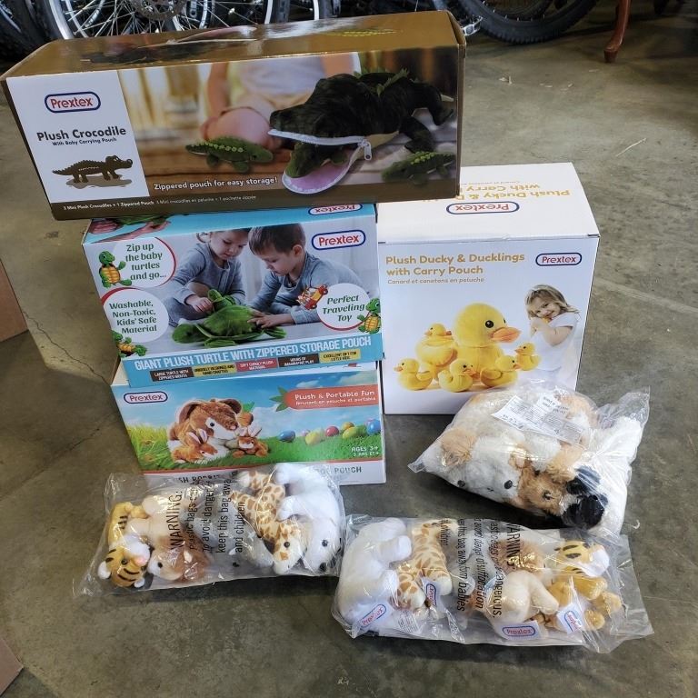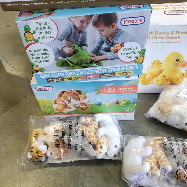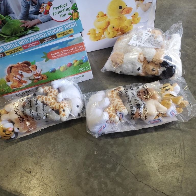ASSORTED NEW PLUSH ANIMAL TOYS: TURTLE, CROCODILE, BUNNY DUCK AND MORE