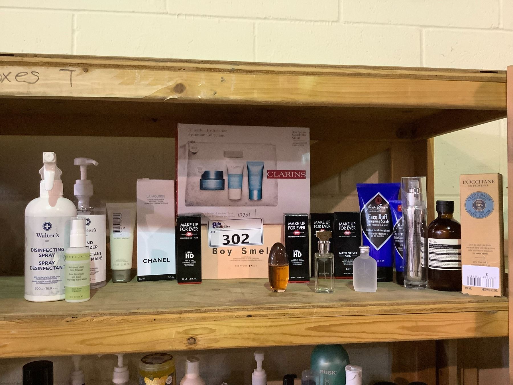 ASSORTED PRODUCTS INCLUDING: CHANEL CLEANSING FOAM, ARMANI GEL, MAKE UP FOREVER ITEMS, JACK BLACK FACE BUFF, CALVIN KLEIN COLOGNE, & MORE