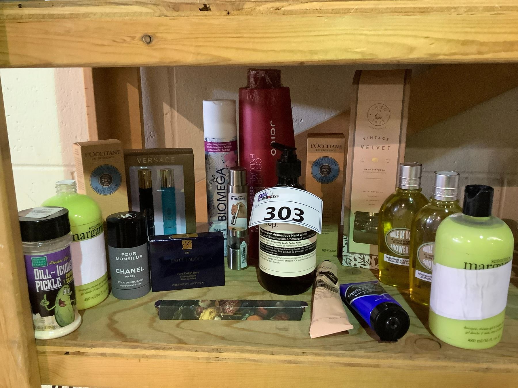 ASSORTED PRODUCTS INCLUDING: VERSACE PERFUME, CHANEL DEODORANT STICK, L'OCCITANE DRY SKIN HAND CREAM, VINTAGE VELVET DIFFUSER, & MORE