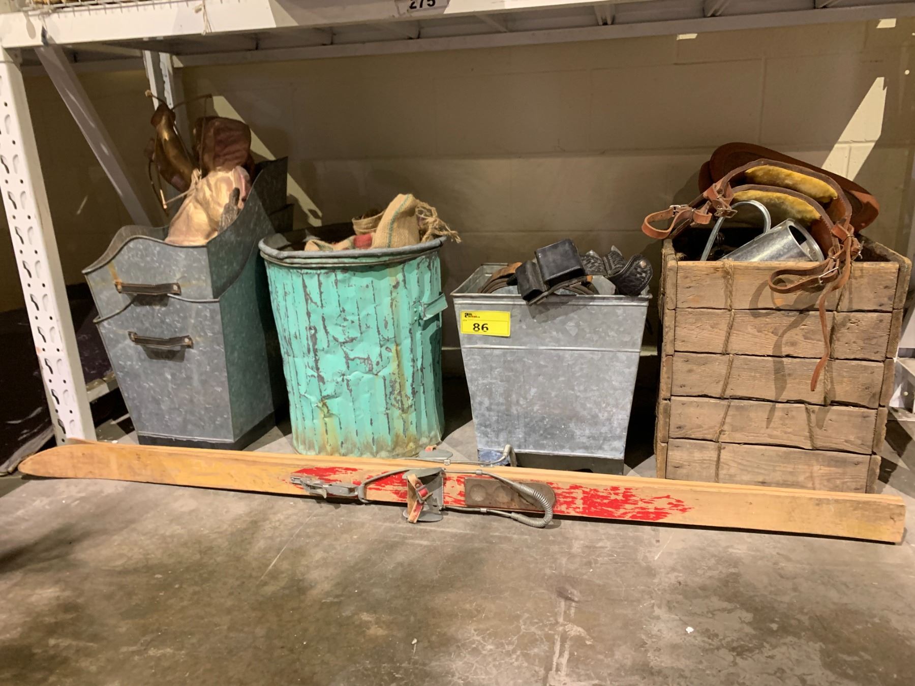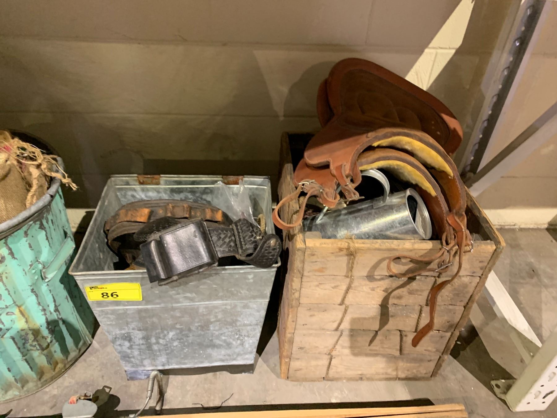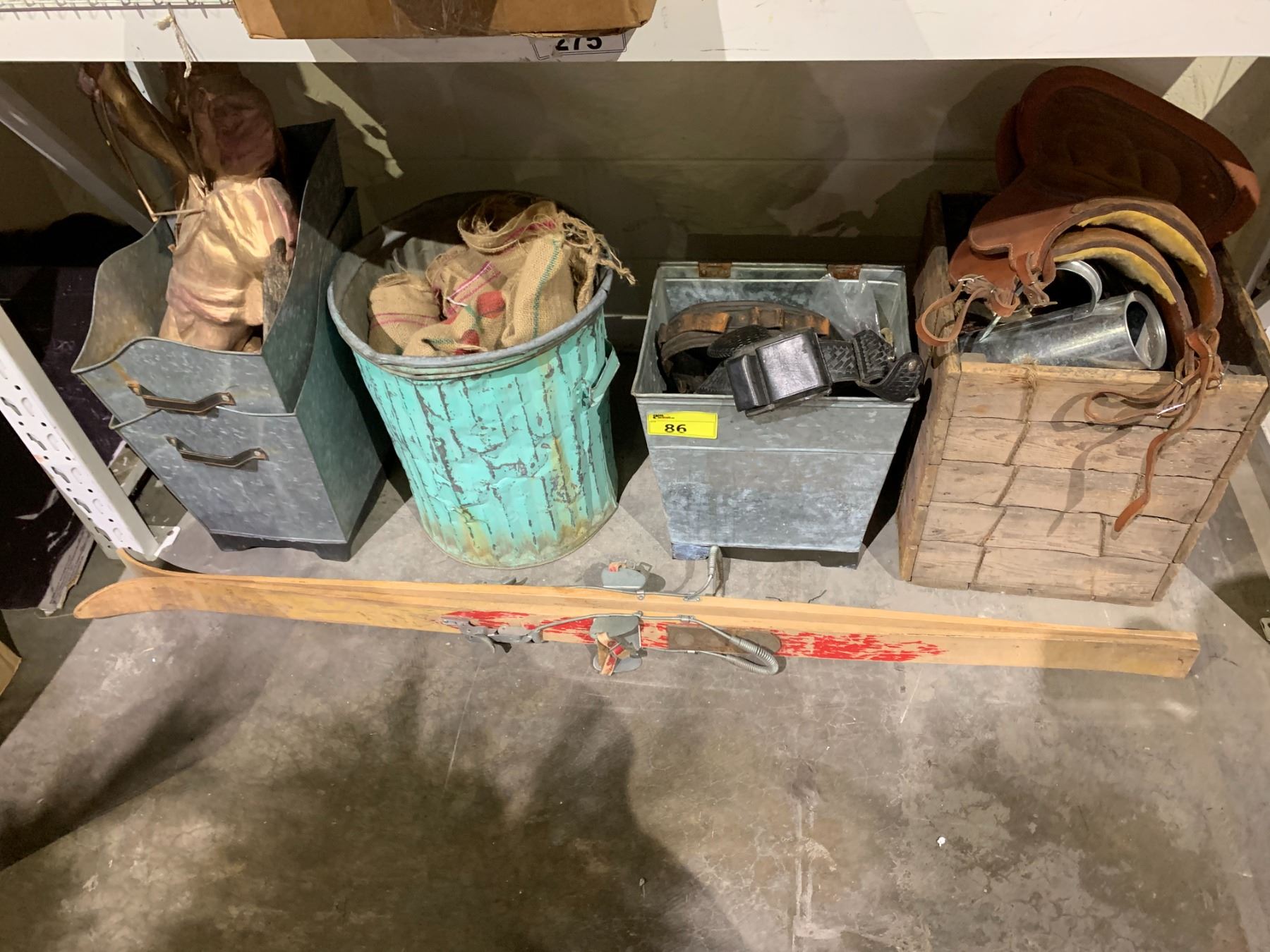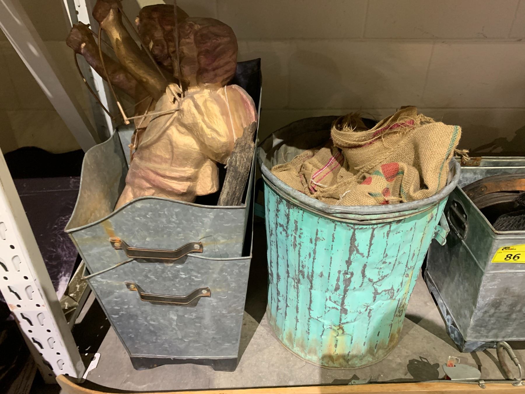 ASSORTED PROPS INCLUDING; HANGING CUPID DECOR, METAL GARBAGE BIN, SADDLES & MORE