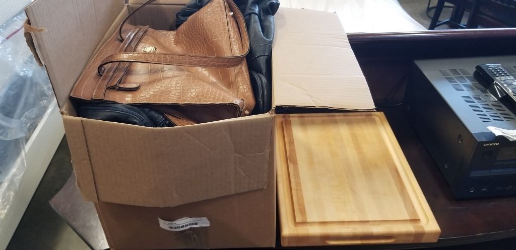 ASSORTED PURSES AND BAGS, LEATHER DUFFEL, AND WOOD CUTTING BOARD