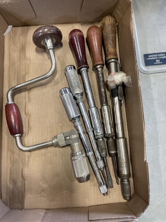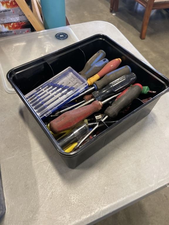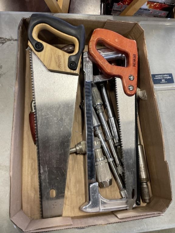 ASSORTED SHOP TOOLS, SAWS, BIT DRIVERS, AND CASE OF SCREWDRIVERS ETC