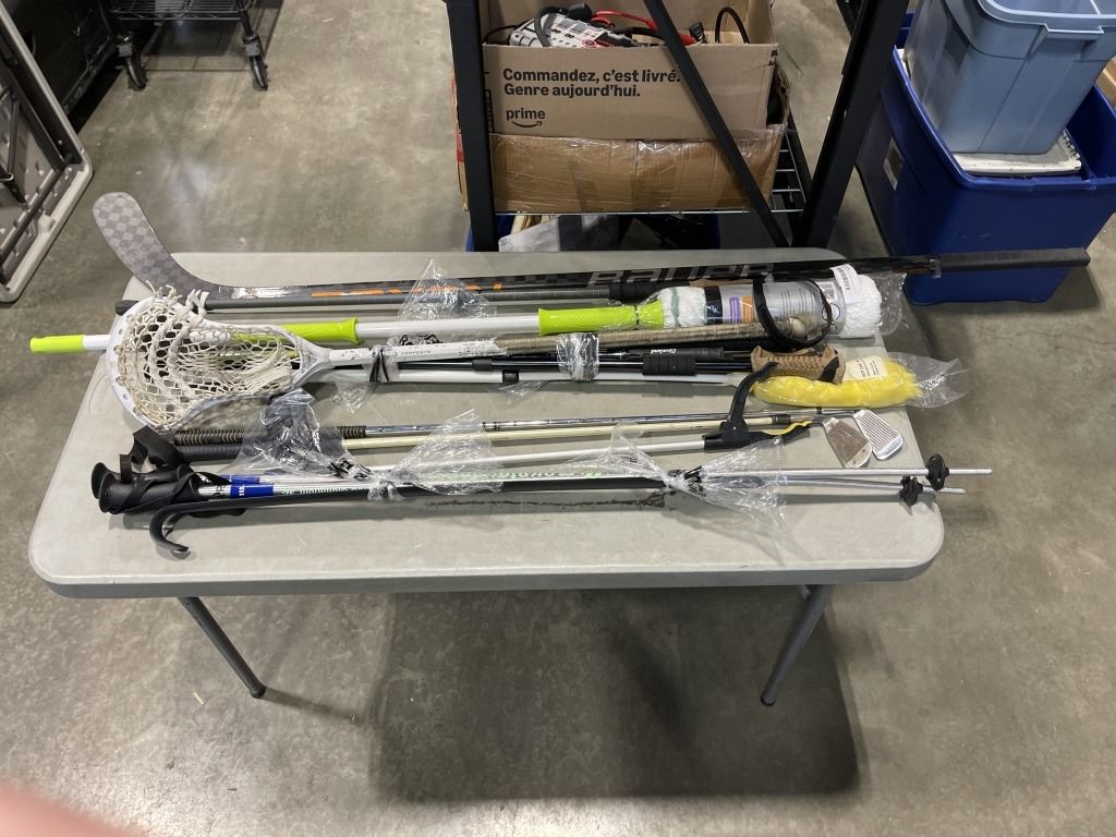 ASSORTED SPORTS ITEMS, HIKING POLES, MOP, GRABBERS ETC