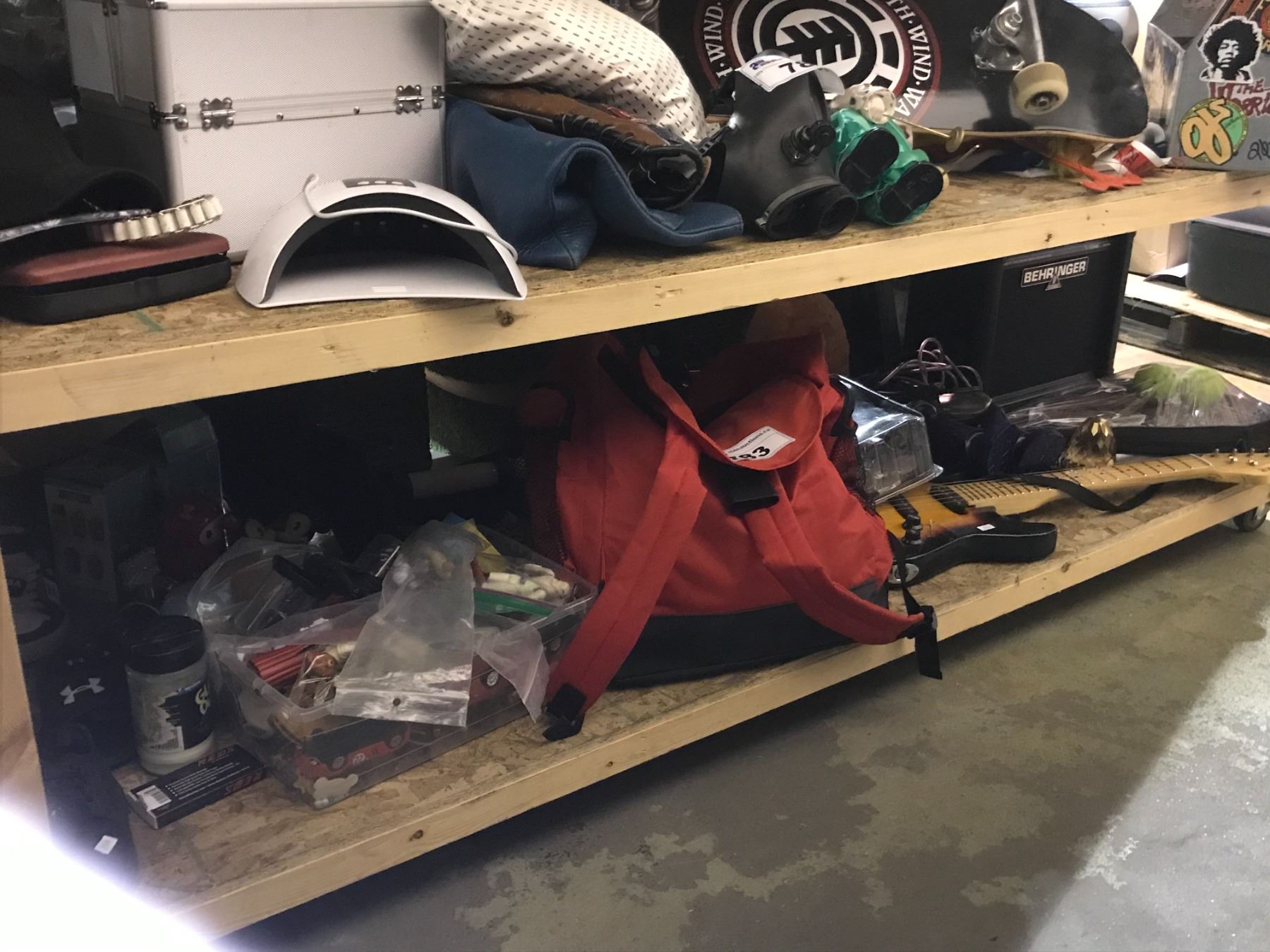 ASSORTED STORAGE LOCKER GOODS: GUITAR, TOYS, BAG, TENNIS RACKET+BALLS, & MORE