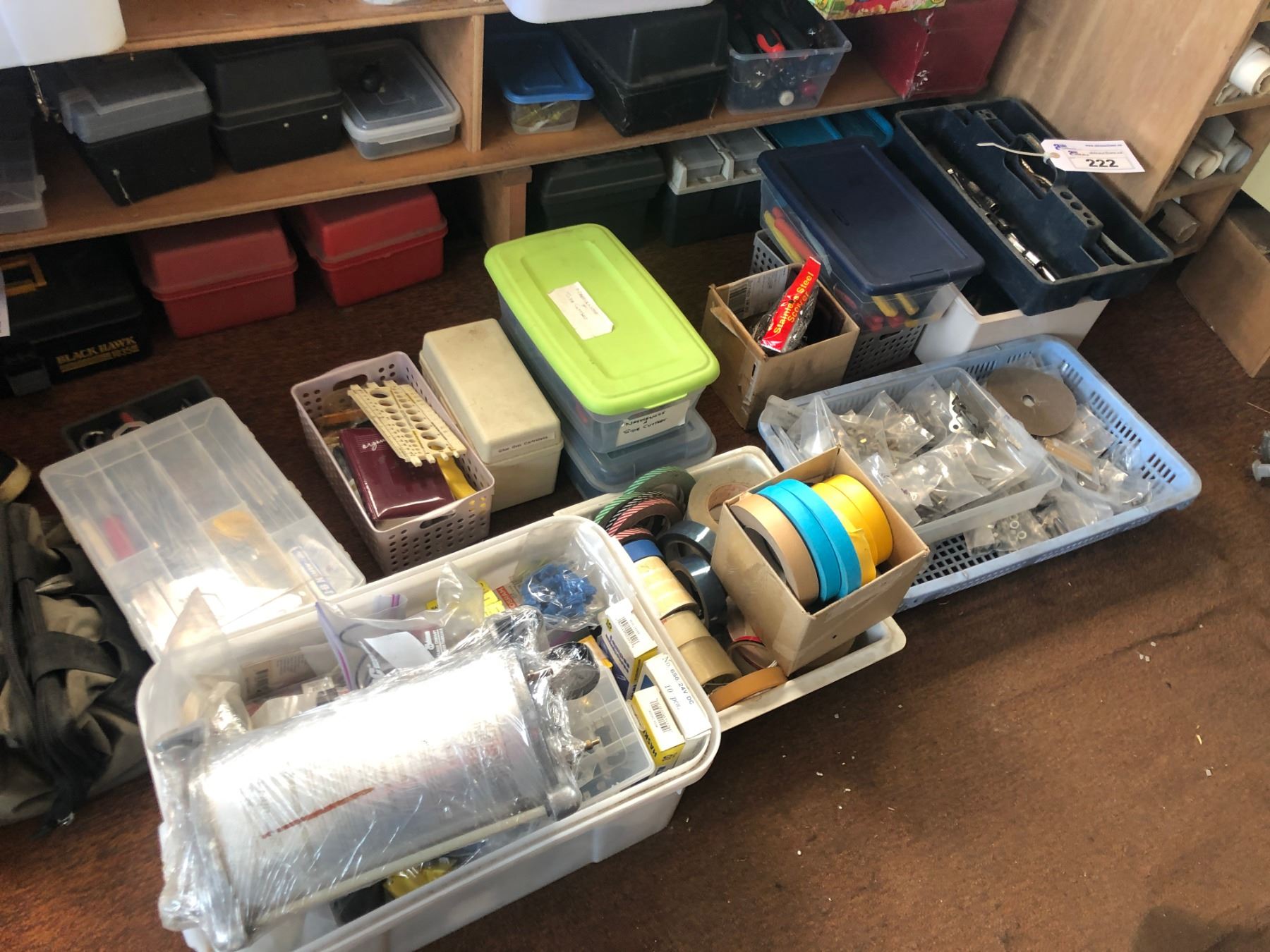 ASSORTED TOOL BOXES/TOOLS, BINS OF NUTS AND BOLTS AND MORE IN FRONT OF SHELF