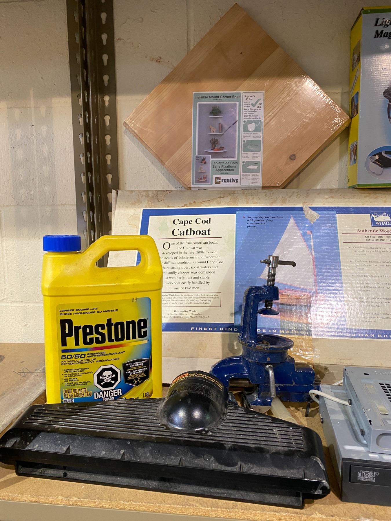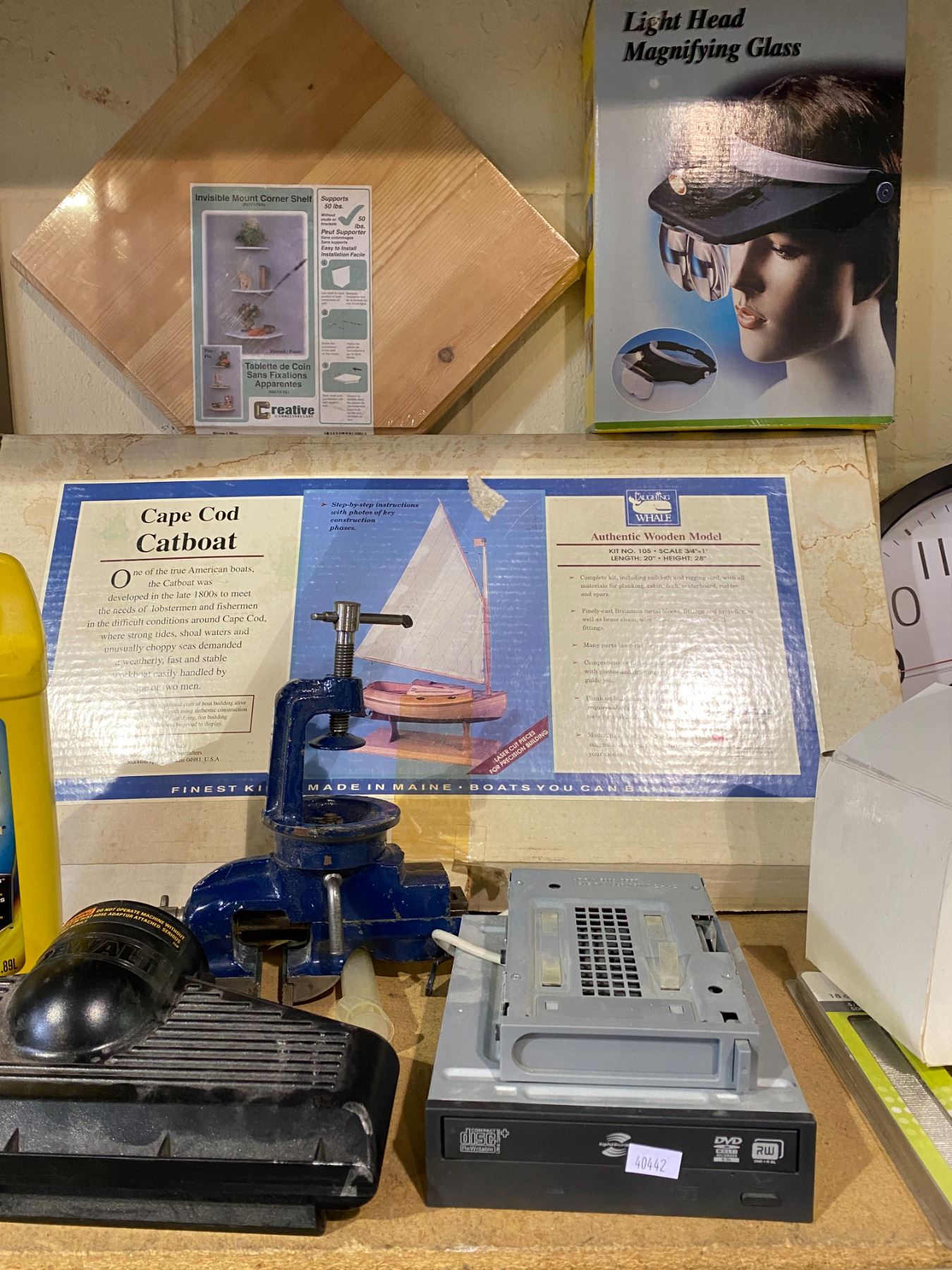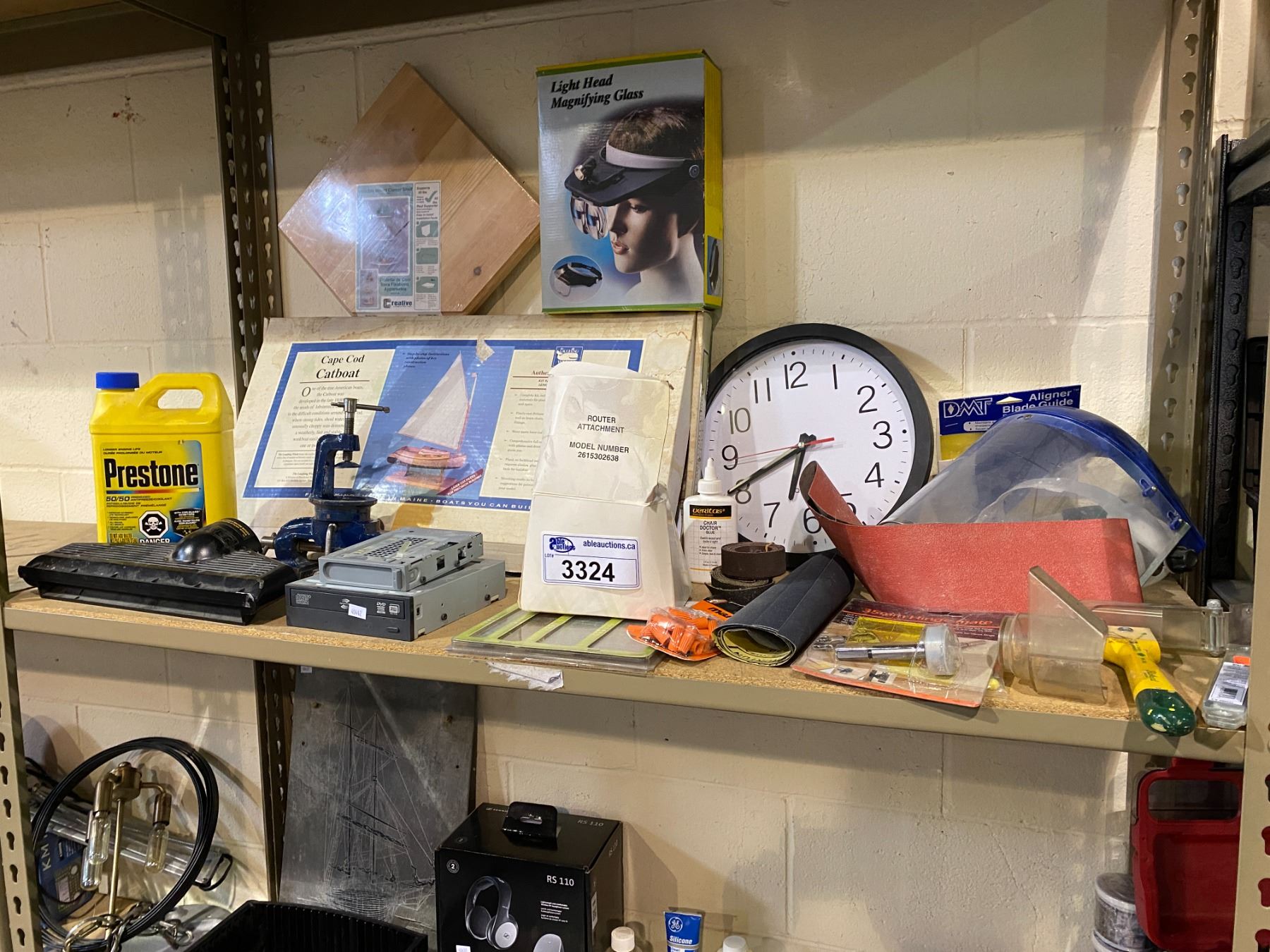 ASSORTED TOOLS, FACE SHIELD, WALL CLOCK, LIGHT HEAD MAGNIFYING GLASS, & MORE