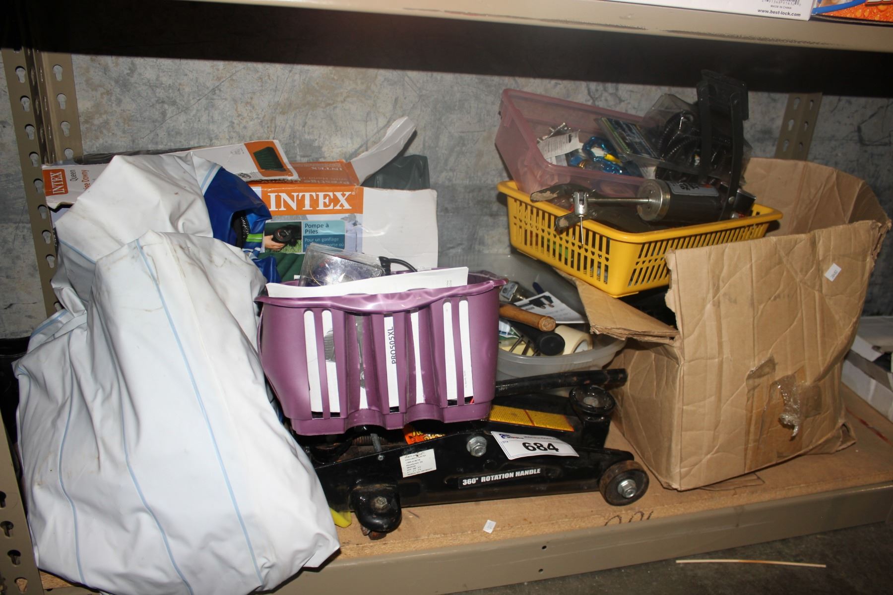ASSORTED TOOLS, FLOOR JACK, INFLATABLE BED, AND MORE