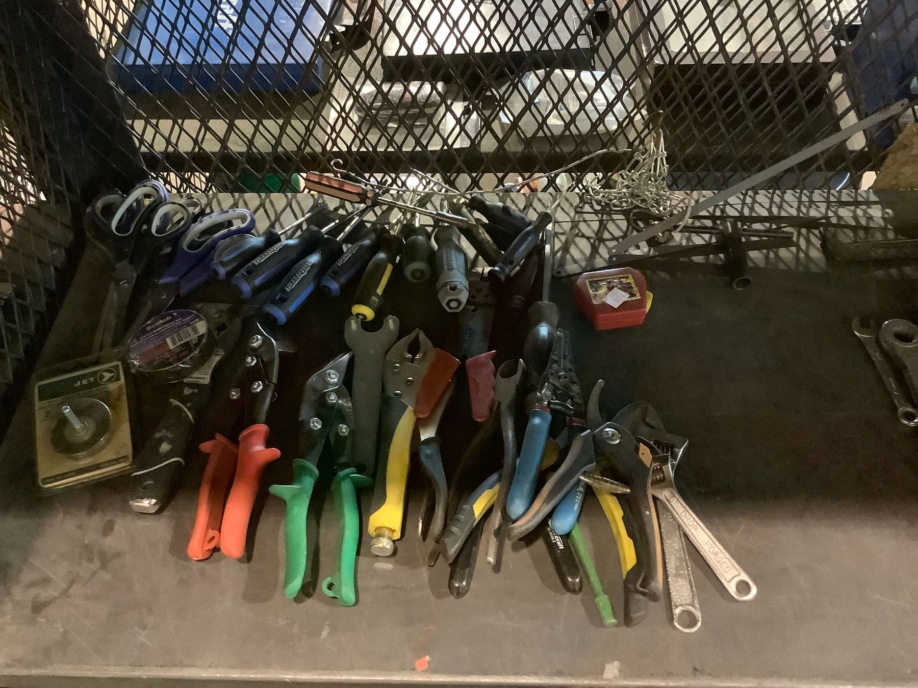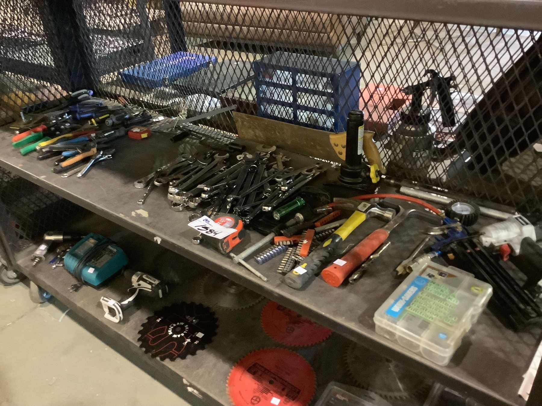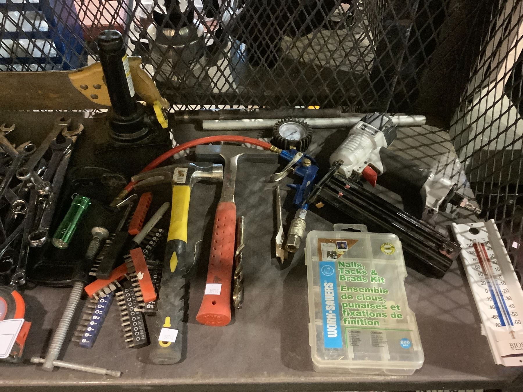 ASSORTED TOOLS; HUSKY NAIL GUN, HAMMERS, WRENCHES, SCREWDRIVERS, AND MORE