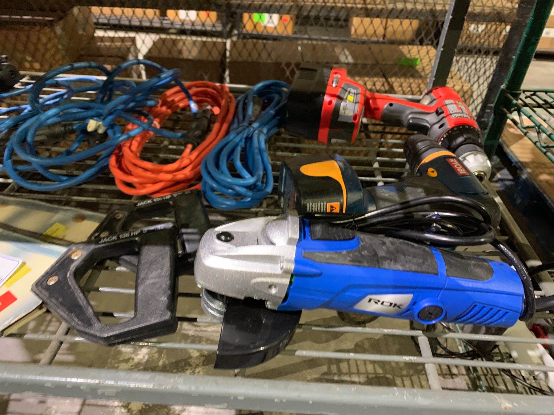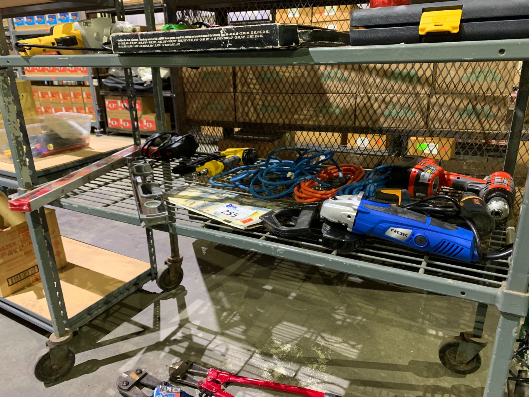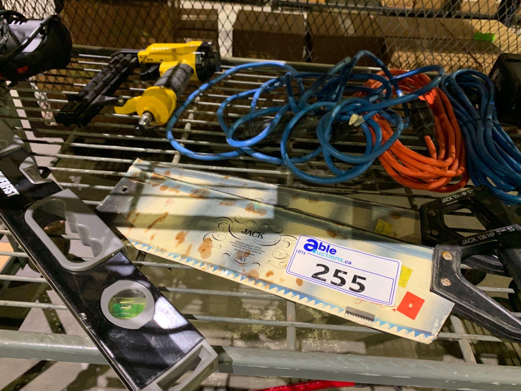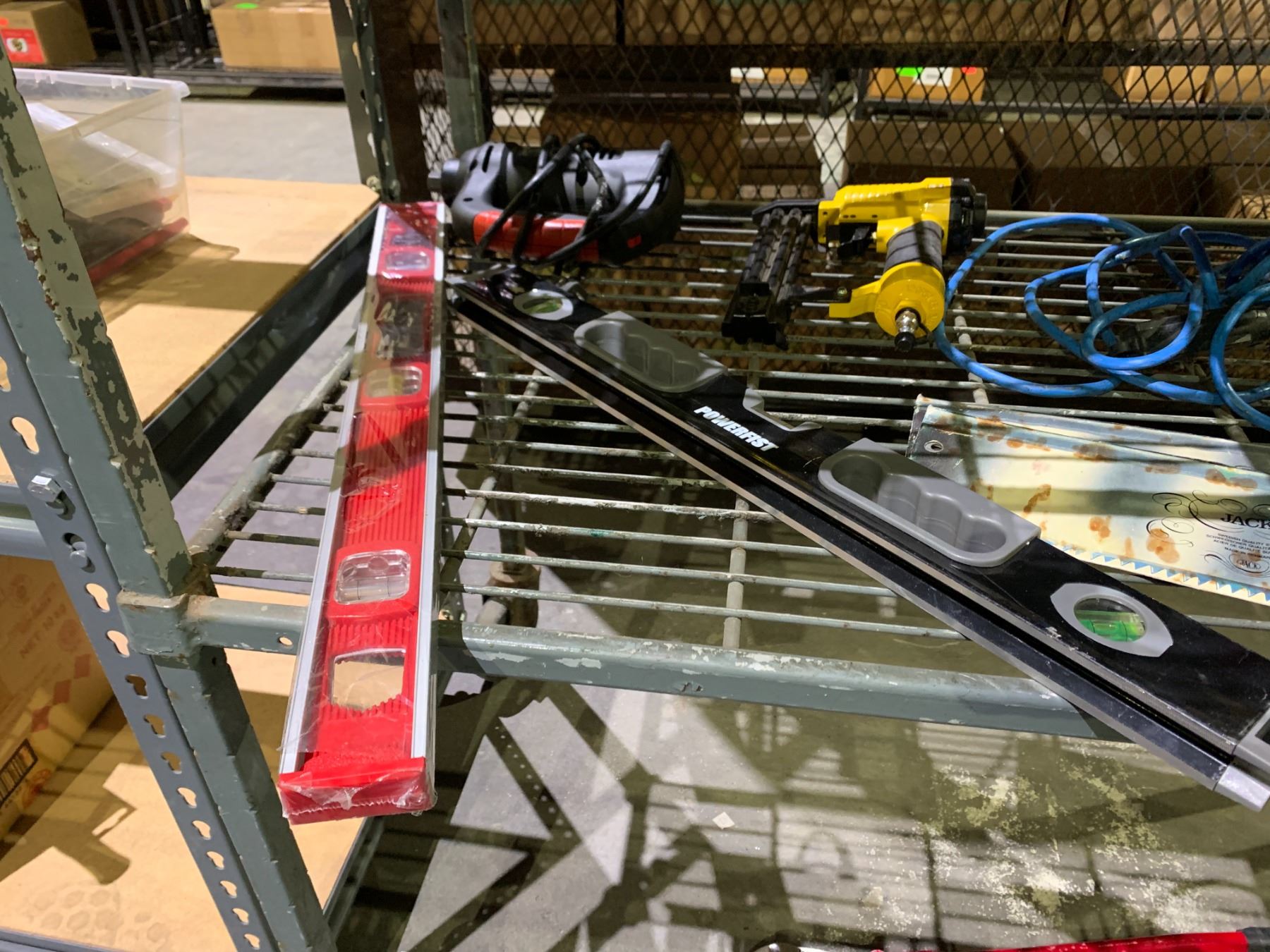 ASSORTED TOOLS INCLUDING; ROK ANGLE GRINDER, NAIL GUN, LEVELS & MORE