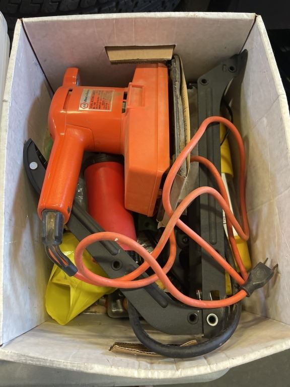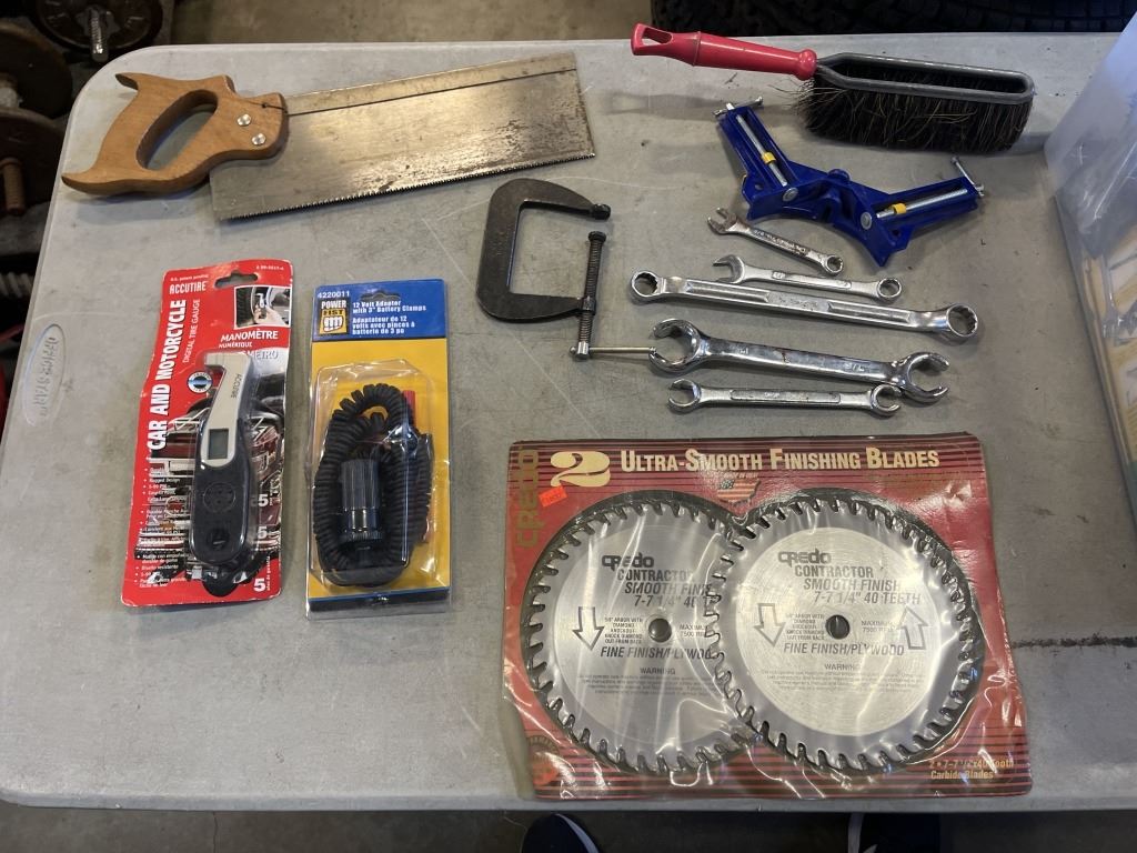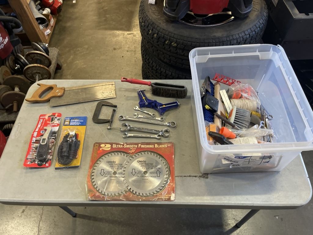 ASSORTED TOOLS, SAW BLADES, WRENCHES, SANDER, WORKLIGHTS AND MORE