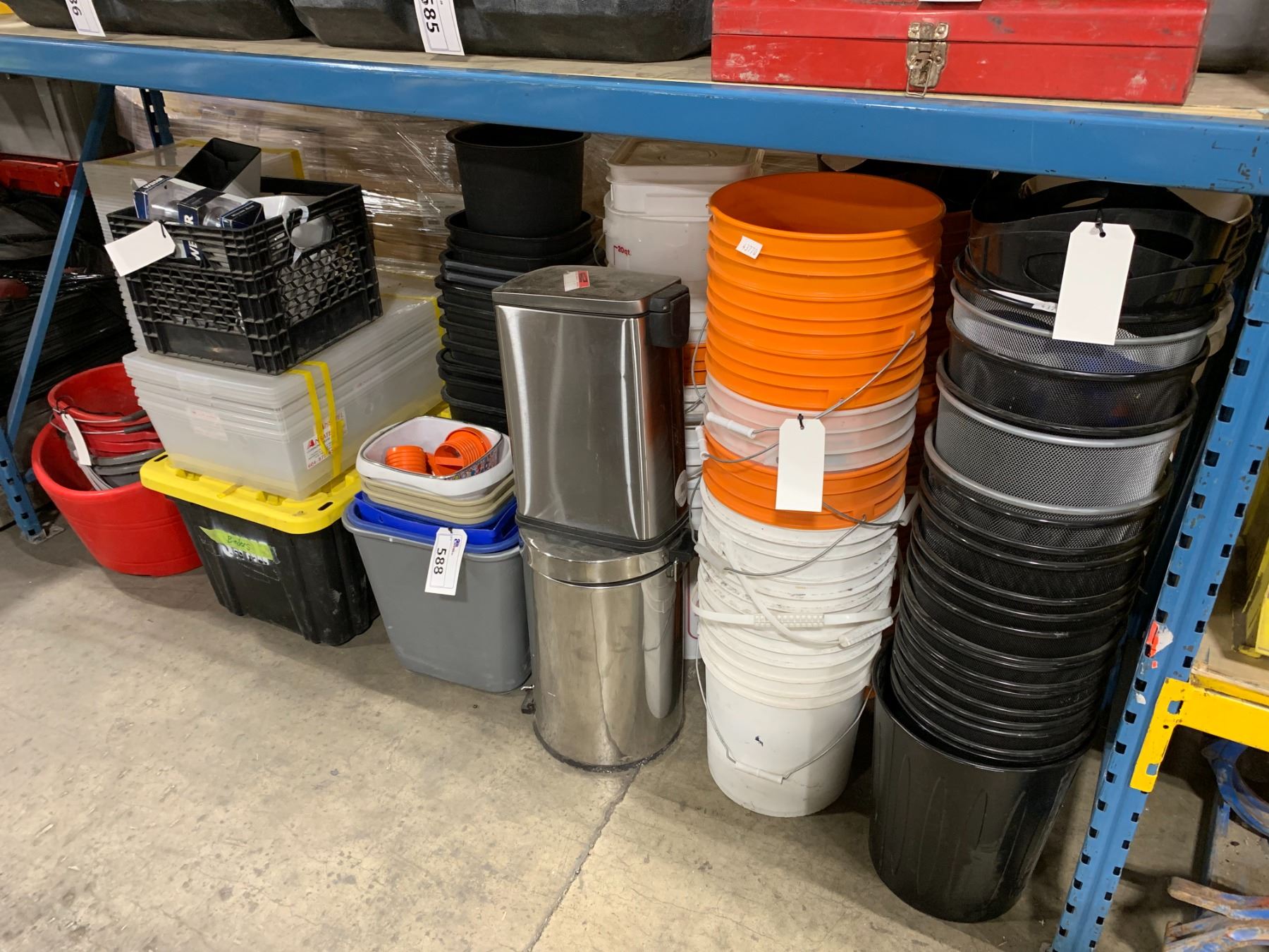ASSORTED VARIOUS KINDS OF BUCKETS, GARBAGE BINS, BINDERS AND BOXES