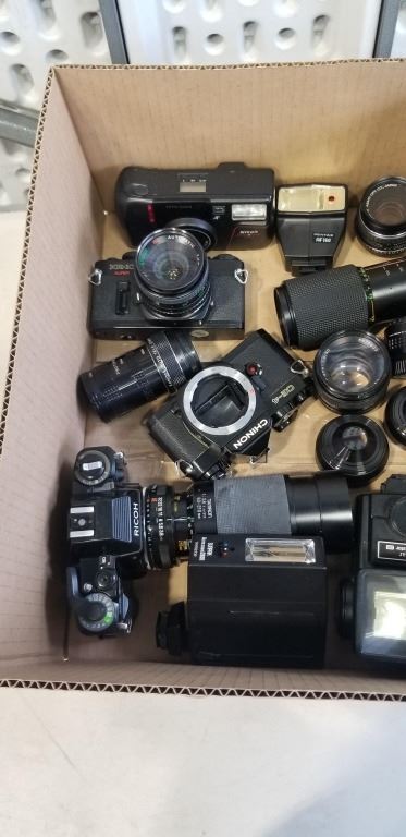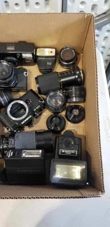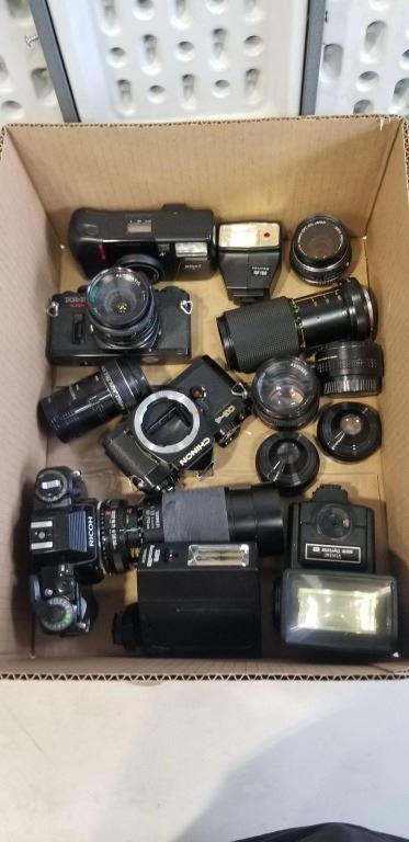 ASSORTED VINTAGE 35MM CAMERAS, LENSES AND FLASHES