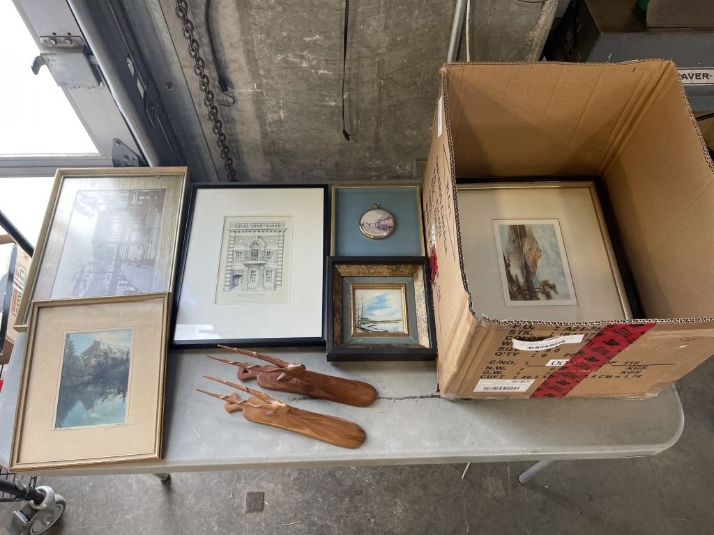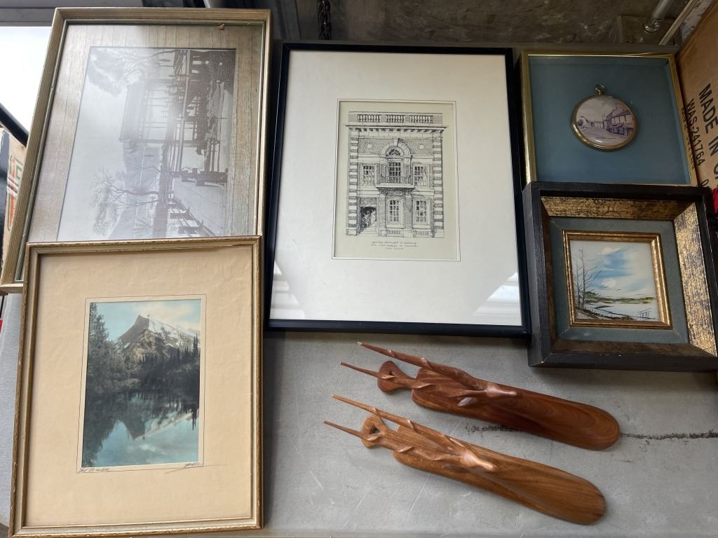 ASSORTED VINTAGE ARTWORK, PICTURES, CARVINGS ETC