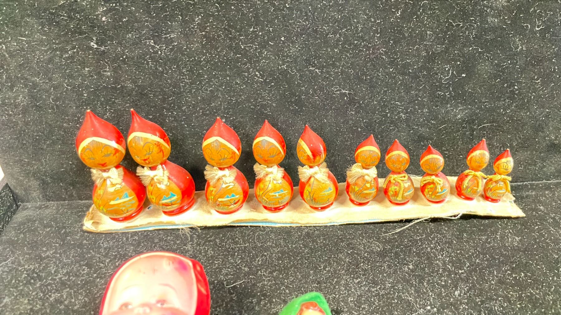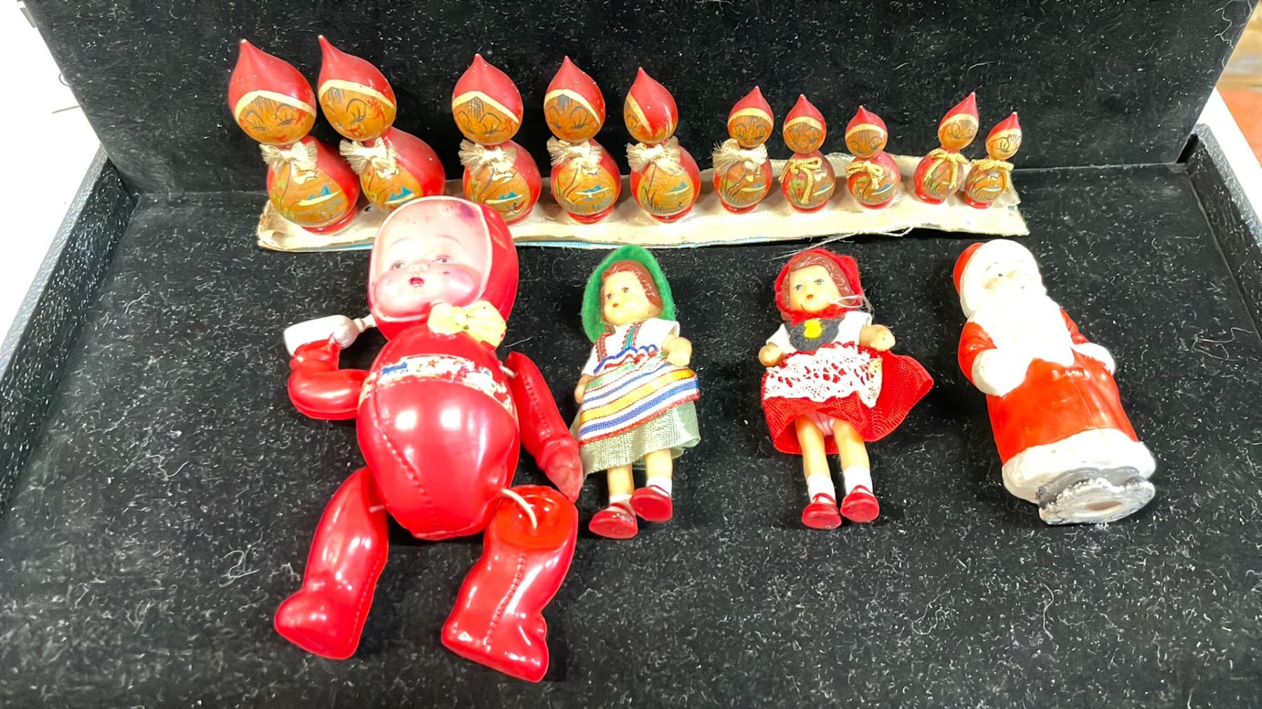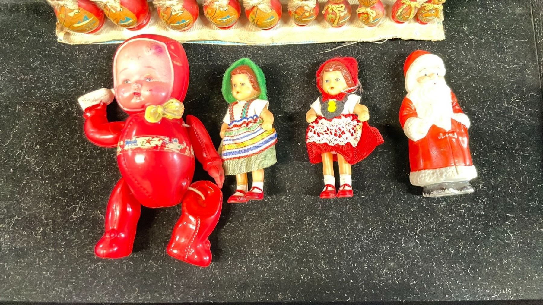 ASSORTED VINTAGE FIGURINES INCLUDING; KOKESHI SHOWA DOLLS, 1920'S SANTA, GERMAN MINIATURE DOLLS & MORE