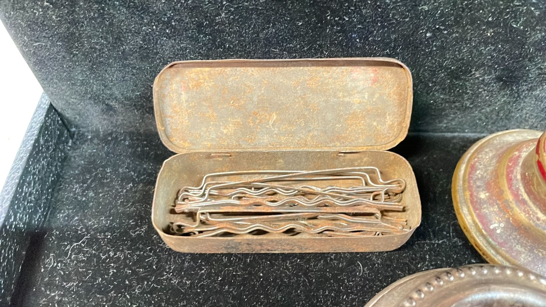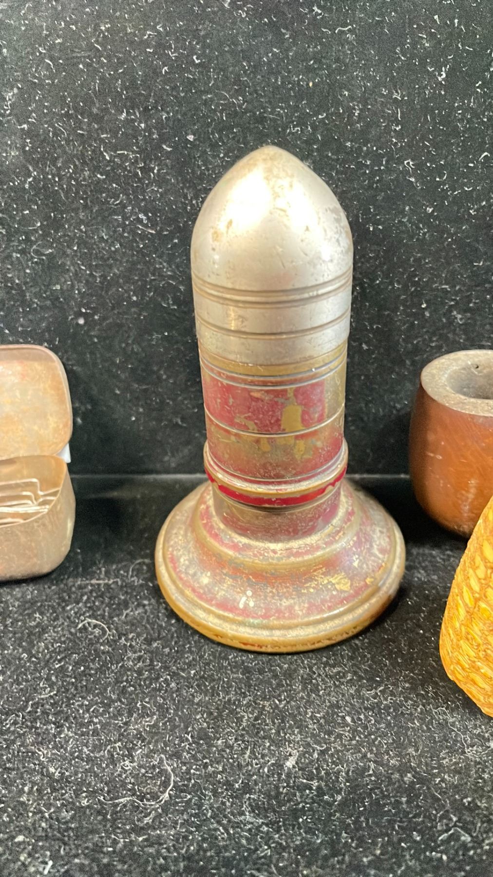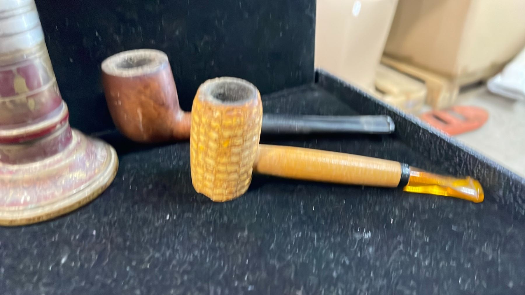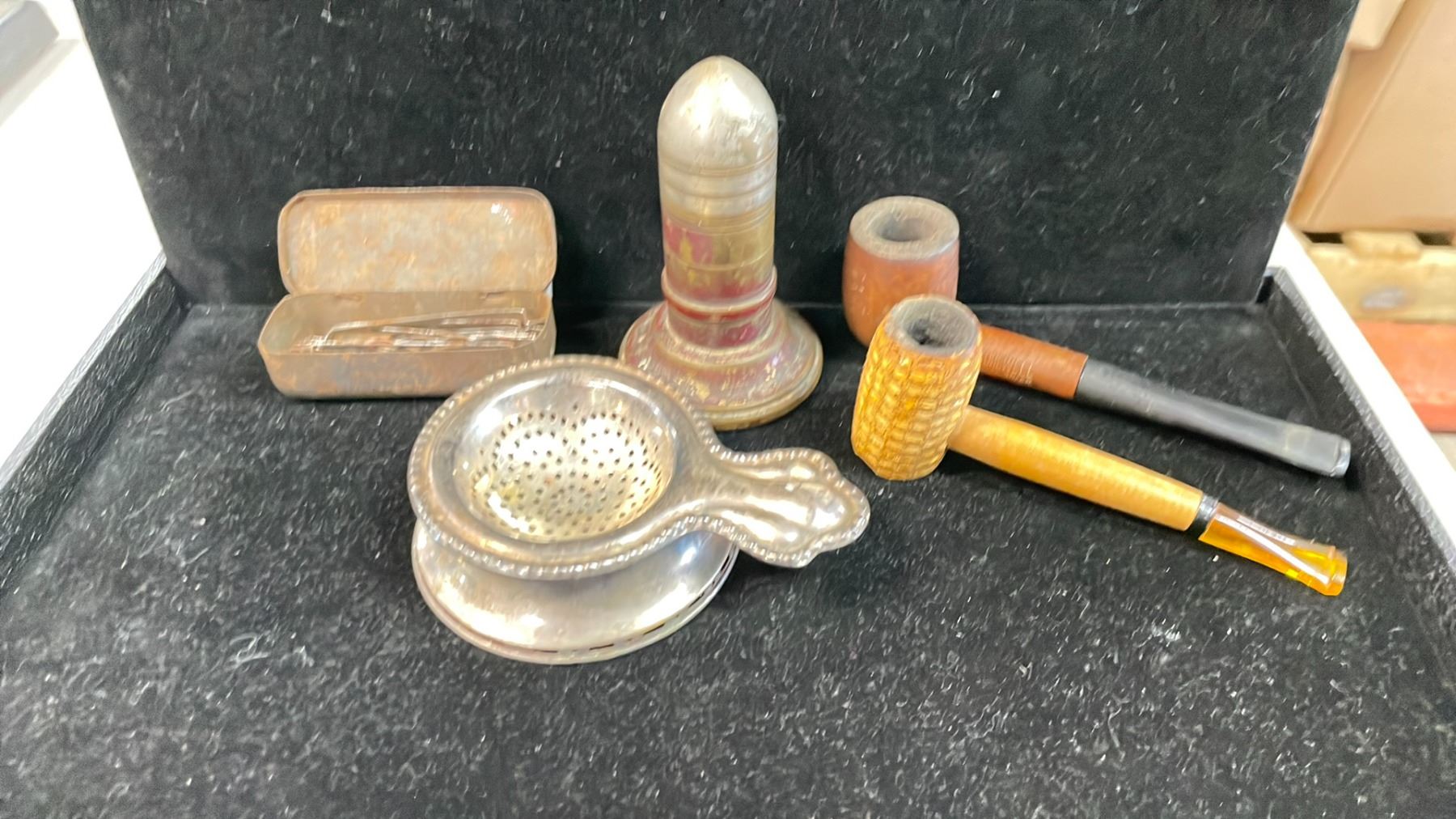 ASSORTED VINTAGE ITEMS INCLUDING; TRENCH LIGHTER, SILVER PLATED BRASS PLATE TEA STRAINER, PIPES & MORE