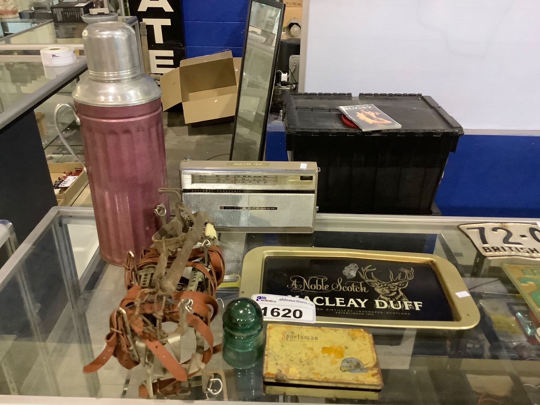 ASSORTED VINTAGE ITEMS: NATIONAL PANASONIC HI0FI 2 SPEAKER RADIO, ANIMA TRAP, SNOW SHOES, THE NOBLE SCOTCH, & MORE