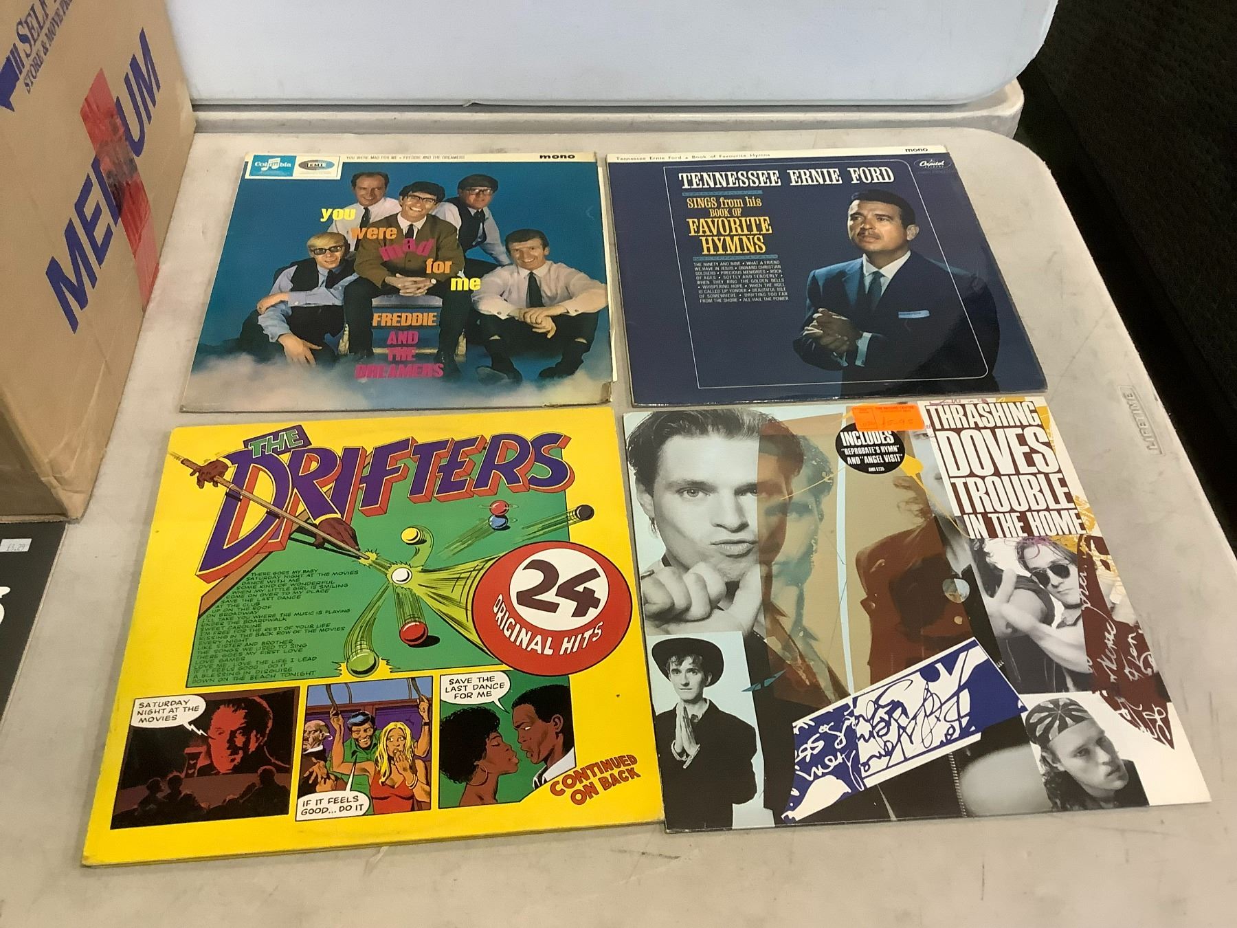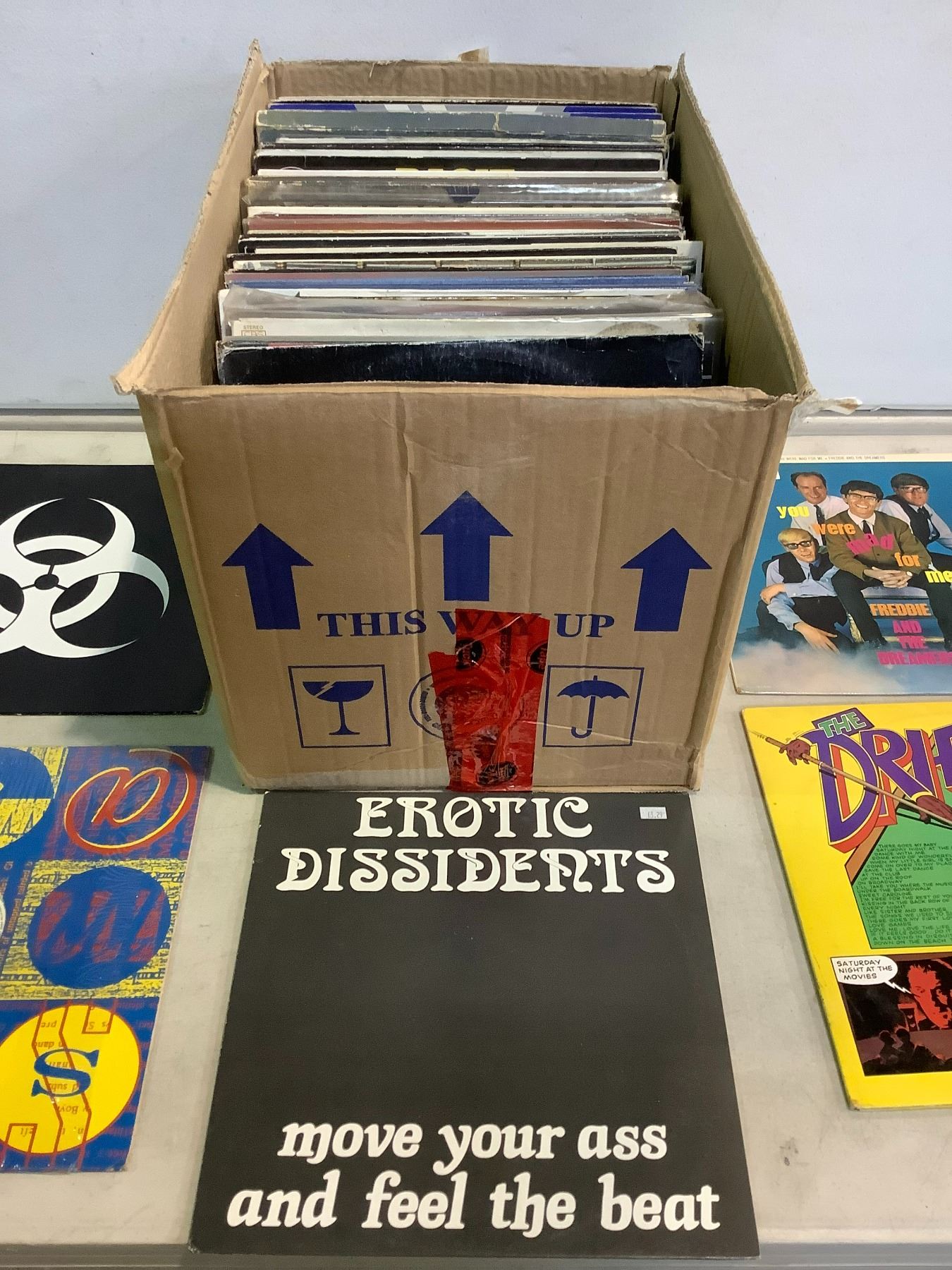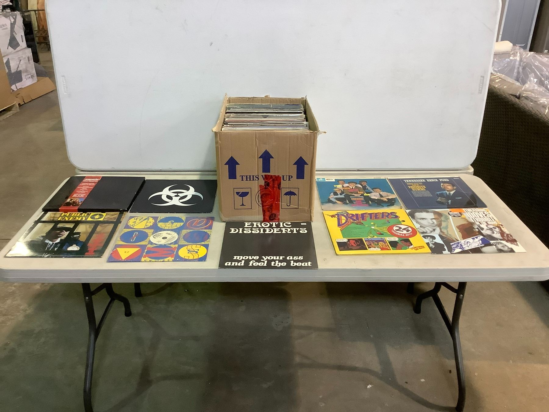 ASSORTED VINYL RECORDS ARTISTS INCLUDE PLEASUREDOME, PUBLIC ENEMY, THE DRIFTERS, TENNESSEE ERNIE FORD, FREDDY AND THE DREAMERS, EROTIC DISSIDENTS, AND MORE, MANY ENGLISH PRESSED