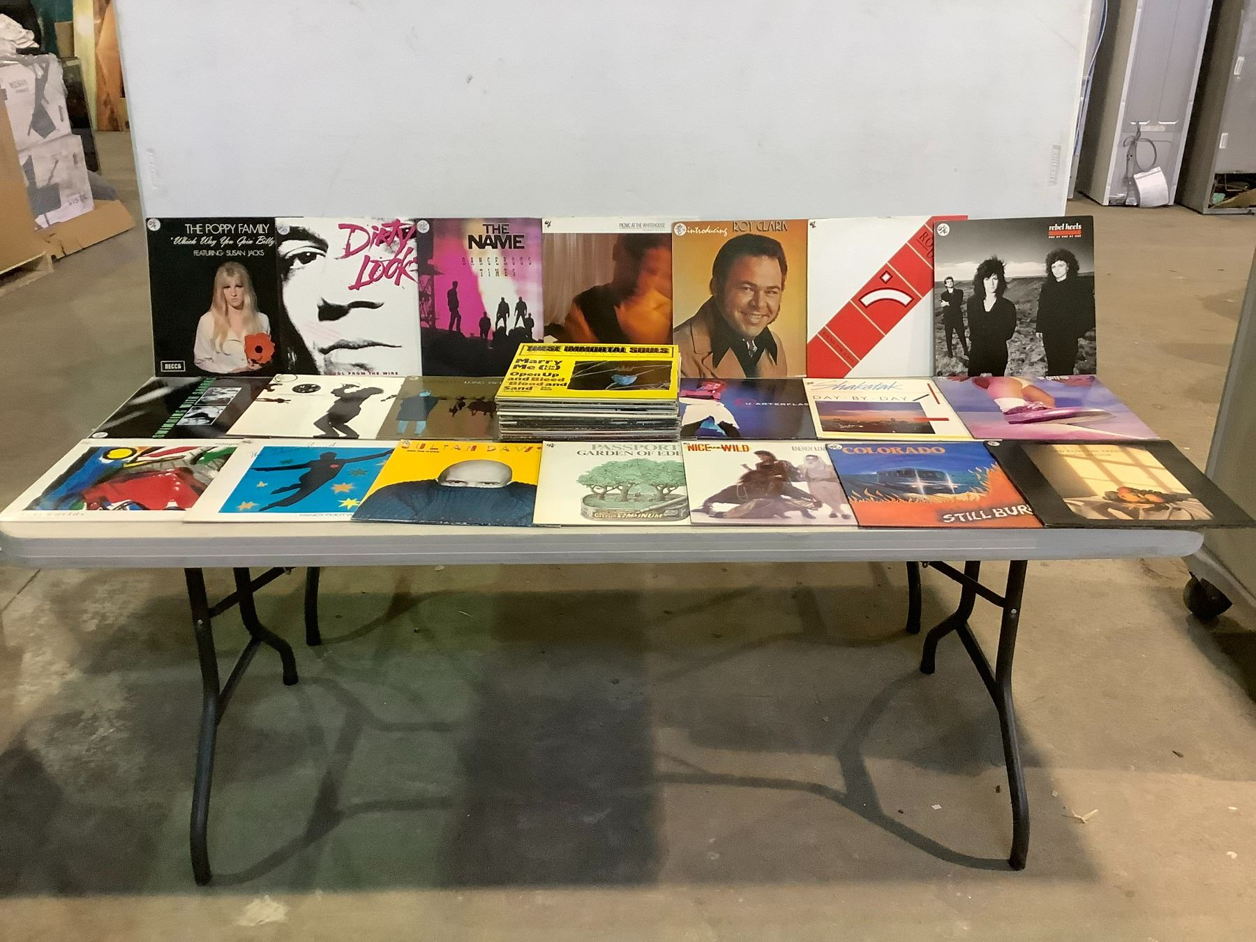 ASSORTED VINYL RECORDS ARTISTS INCLUDE REBEL HEELS, ROY CLARK, THE NAME, COLORADO, PASSPORT, VIRUS