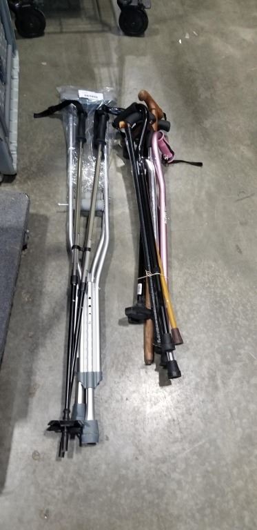 ASSORTED WALKING CANES, POLES, CRUTCHES ETC