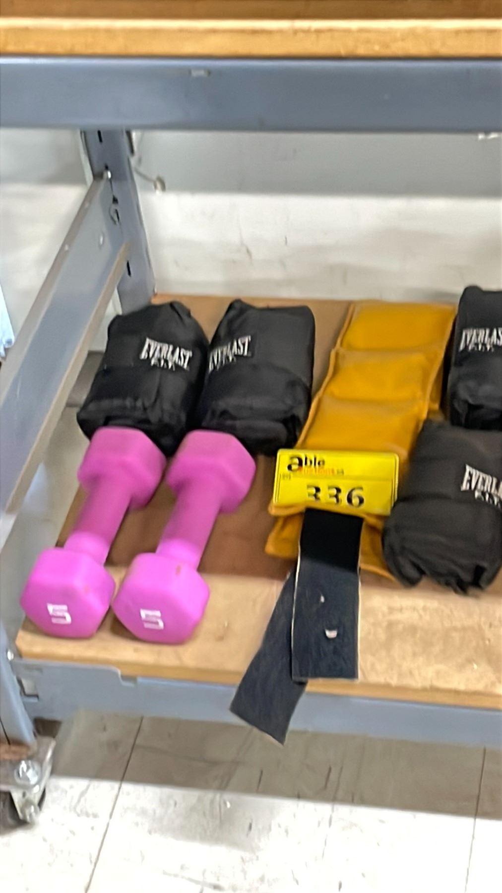 ASSORTED WEIGHTS INCLUDING; 5 LBS DUMBBELLS, ANKLE/WRIST WEIGHTS & WAIST WEIGHTS