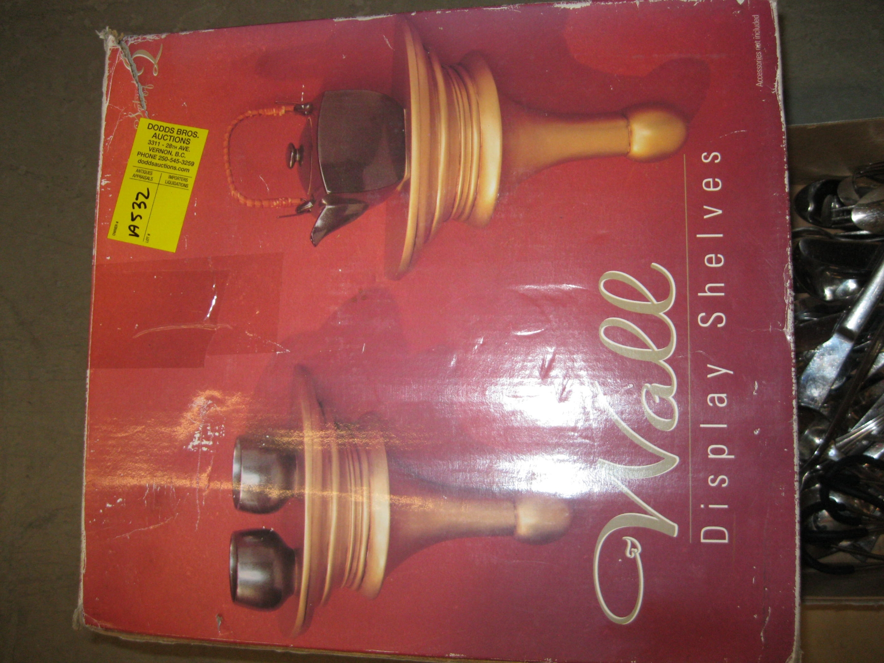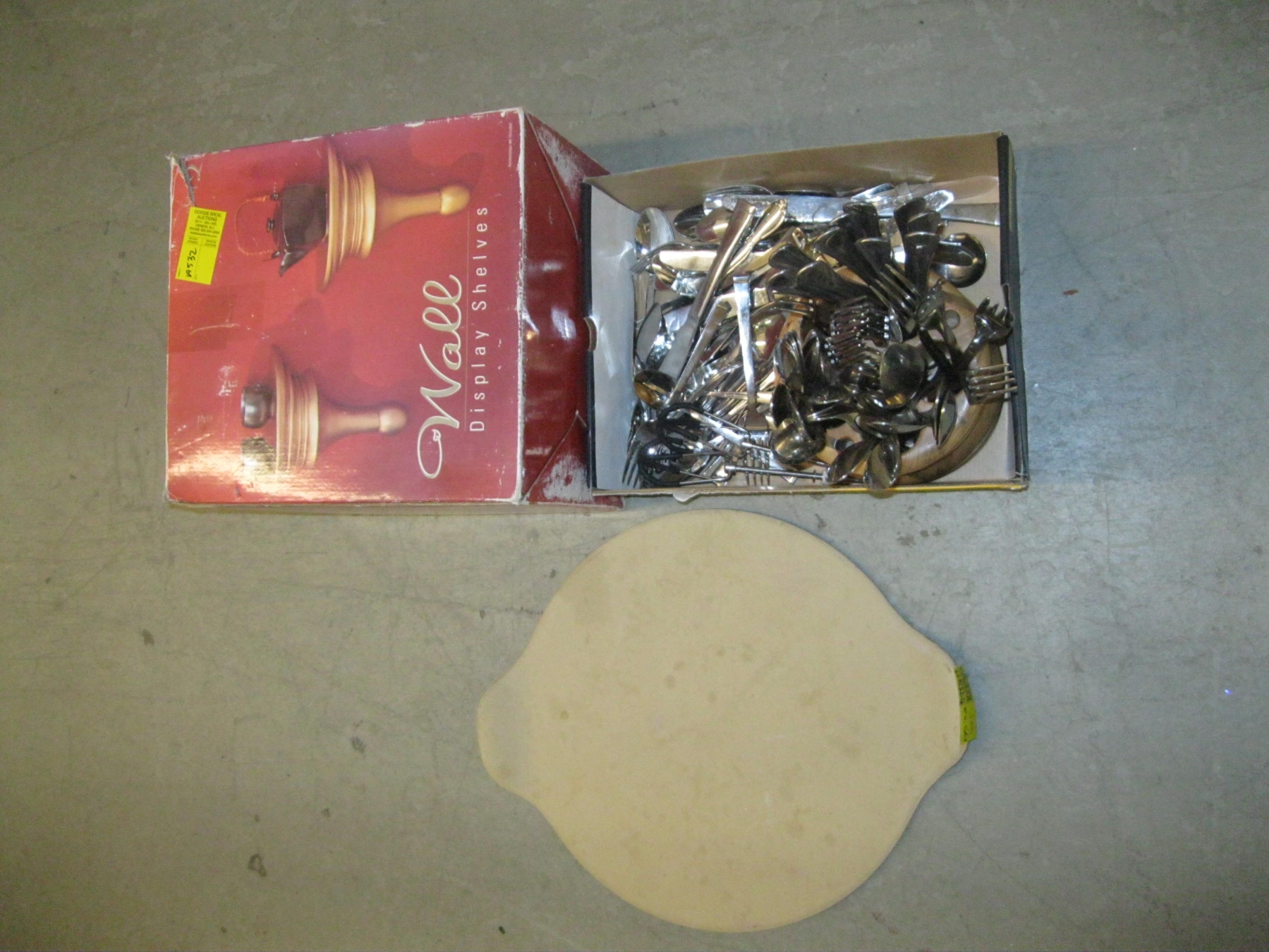 ASST. CUTLERY, PAMPERED CHEF PIZZA STONE & A WALL MOUNT DISPLAY SHELVES