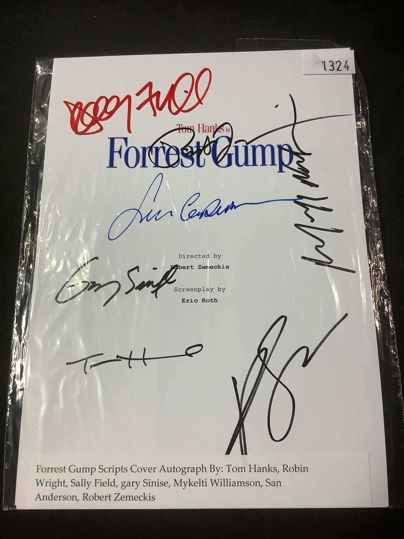 AUTOGRAPHED FORREST GUMP SCRIPT COVER WITH COA (SIGNED BY TOM HANKS, ROBIN WRIGHT, SALLY FIELD, GARY SINISE, MYKELTI WILLIAMSON, SAN ANDERSON, ROBERT ZEMECKIS)
