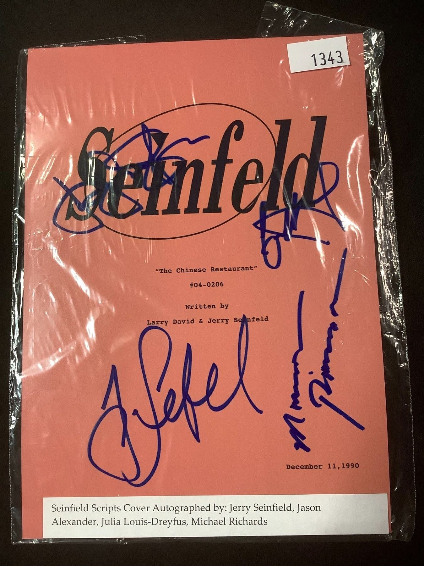 AUTOGRAPHED SEINFELD SCRIPT COVER WITH COA (SIGNED BY JERRY SEINFELD, JASON ALEXANDER, JULIA LOUIS-DREYFUS, MICHAEL RICHARDS)